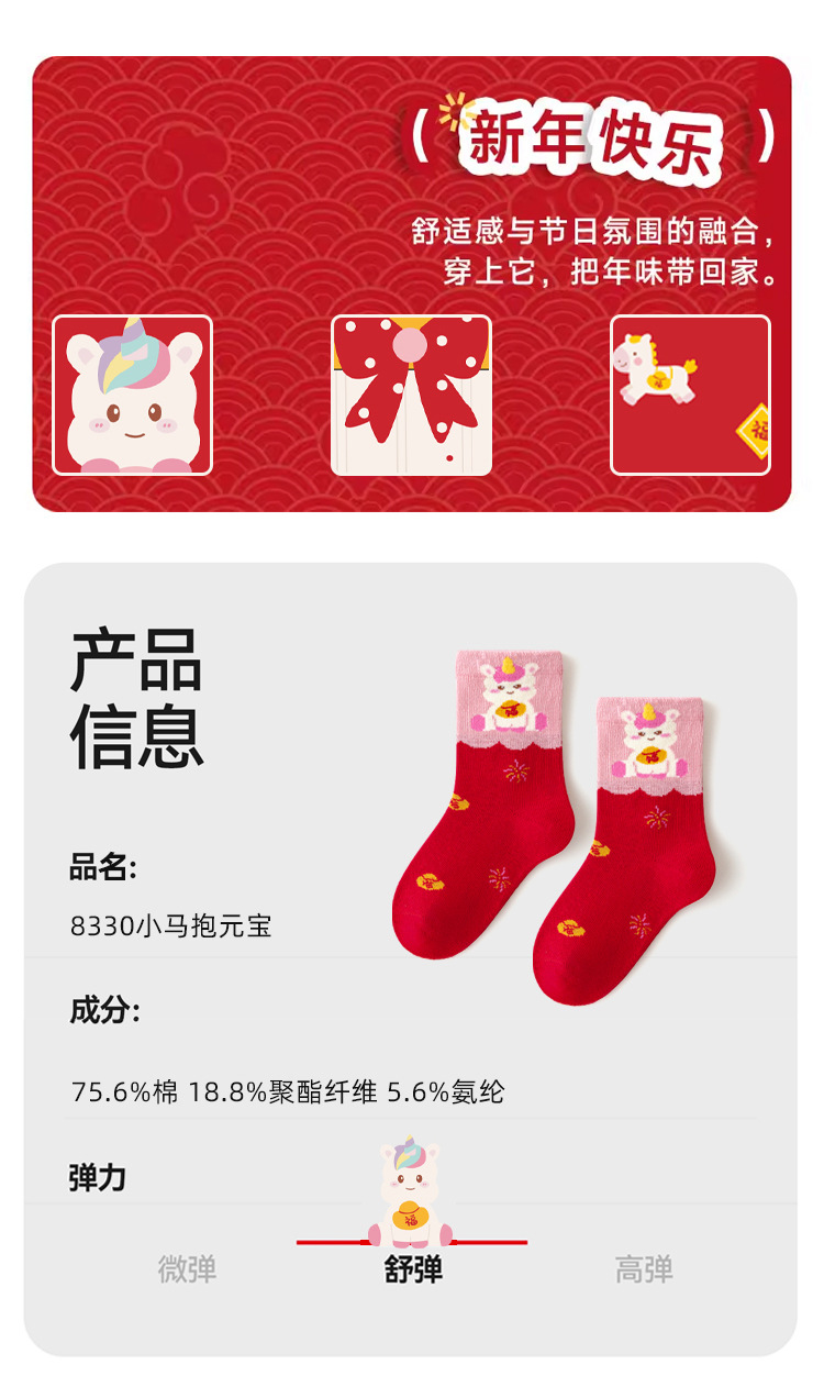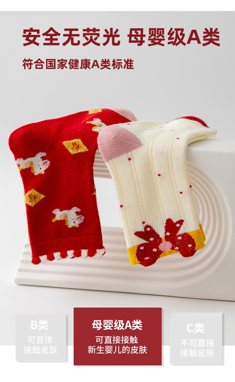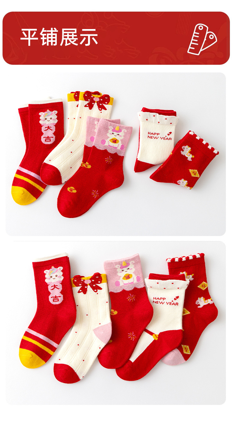 超值五双【本命年过年袜❗无骨精梳棉】马年秋冬大红色新年袜中筒袜无骨精梳棉中大童儿童袜子本命年。r'f