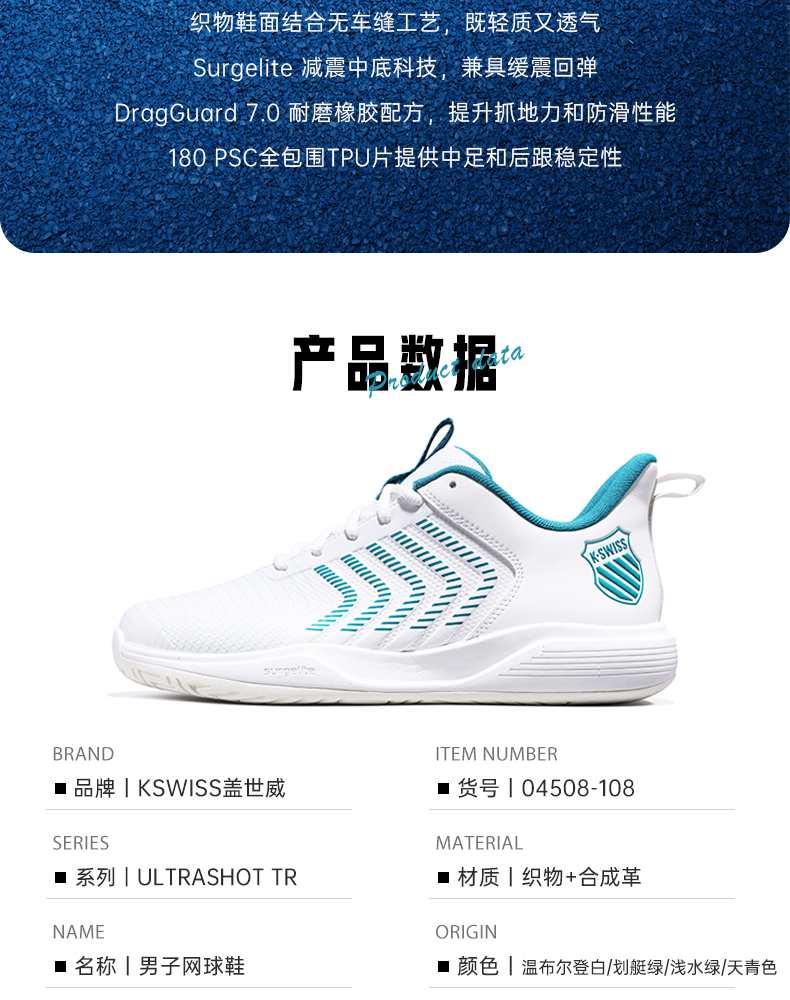 张之臻版25新款盖世威KSWISS ULTRASHOT 缓冲耐磨运动男子网球鞋