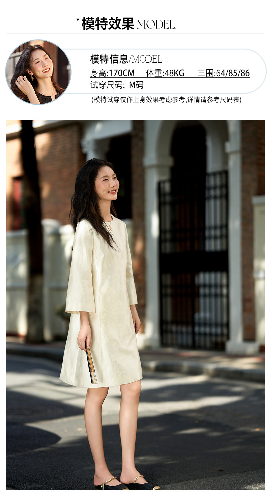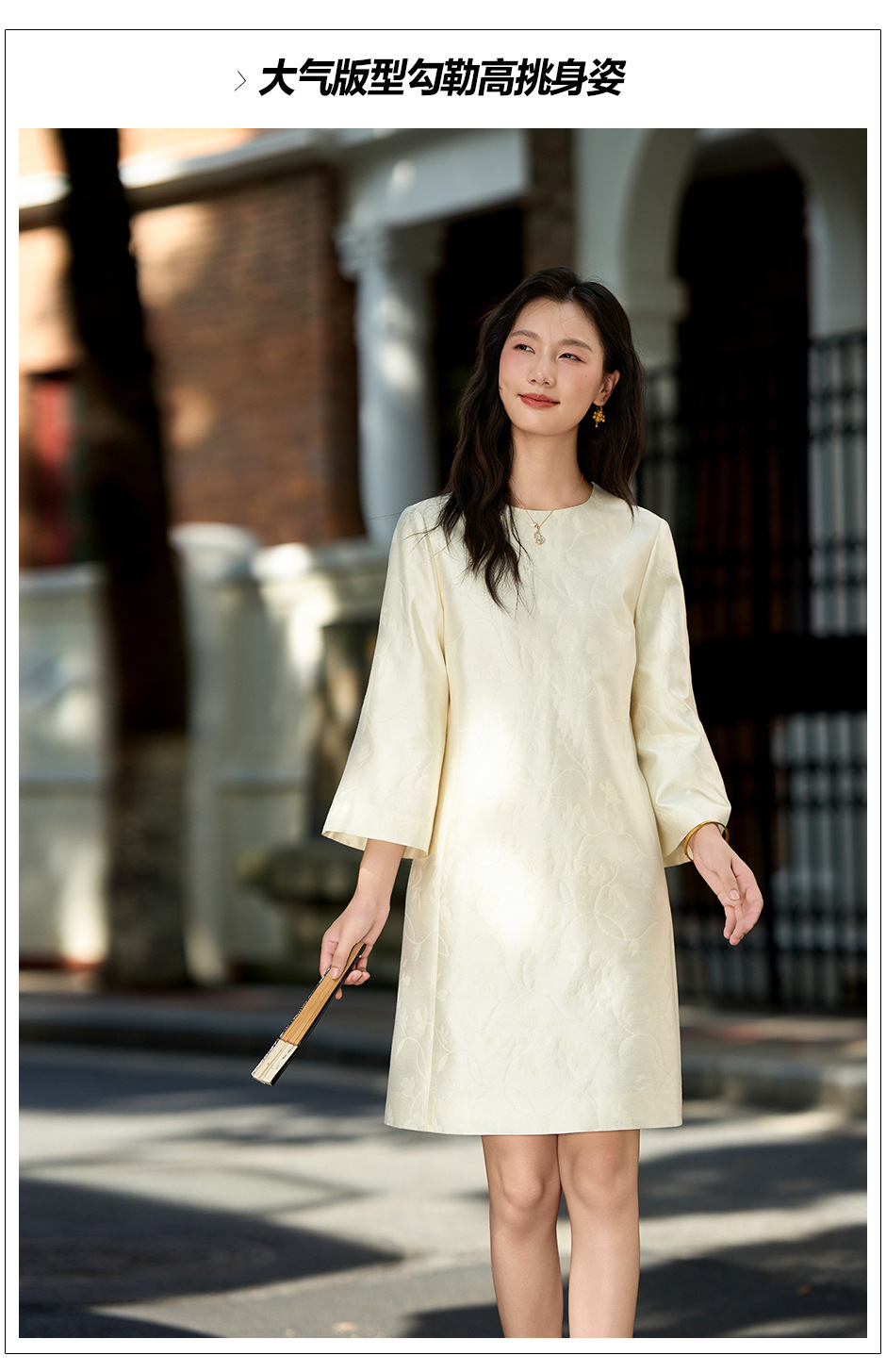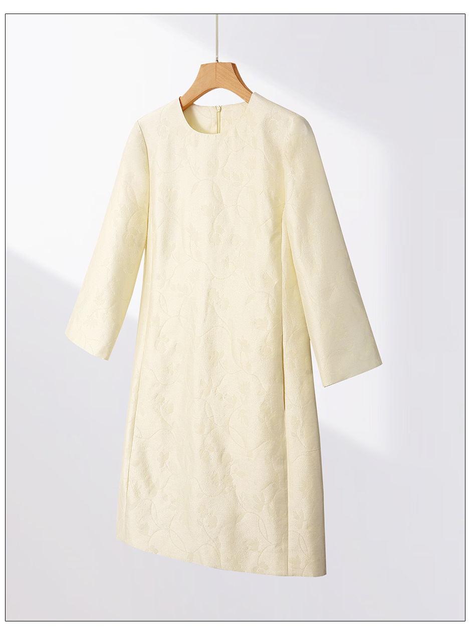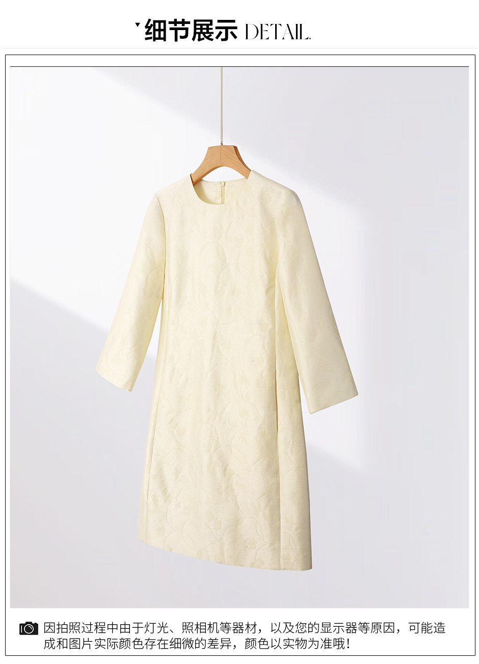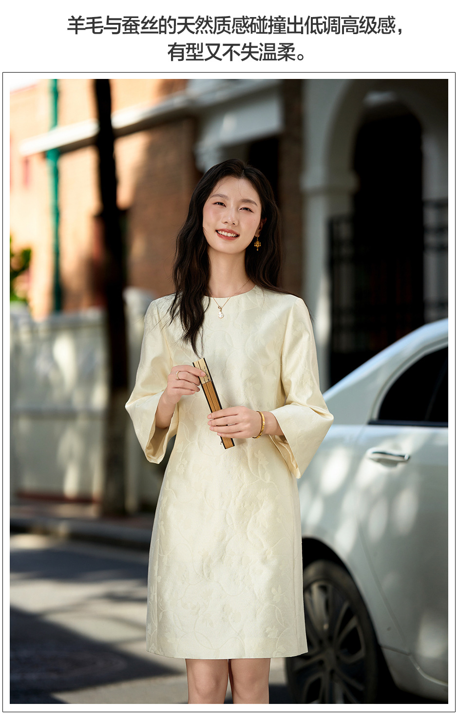 丁摩 秋冬丝毛混暗纹提花连衣裙 圆领九分袖中长款通勤百搭简约5ZF-76005