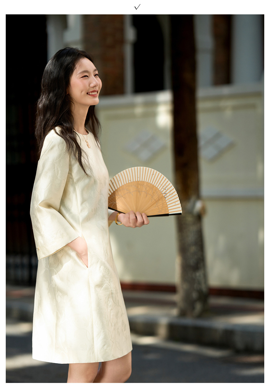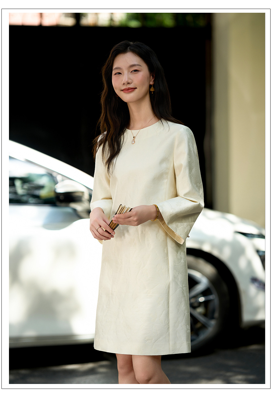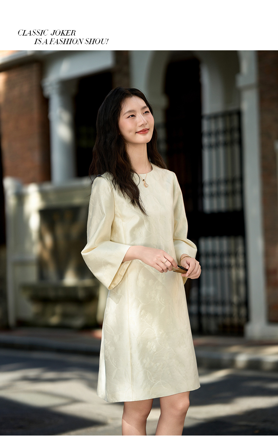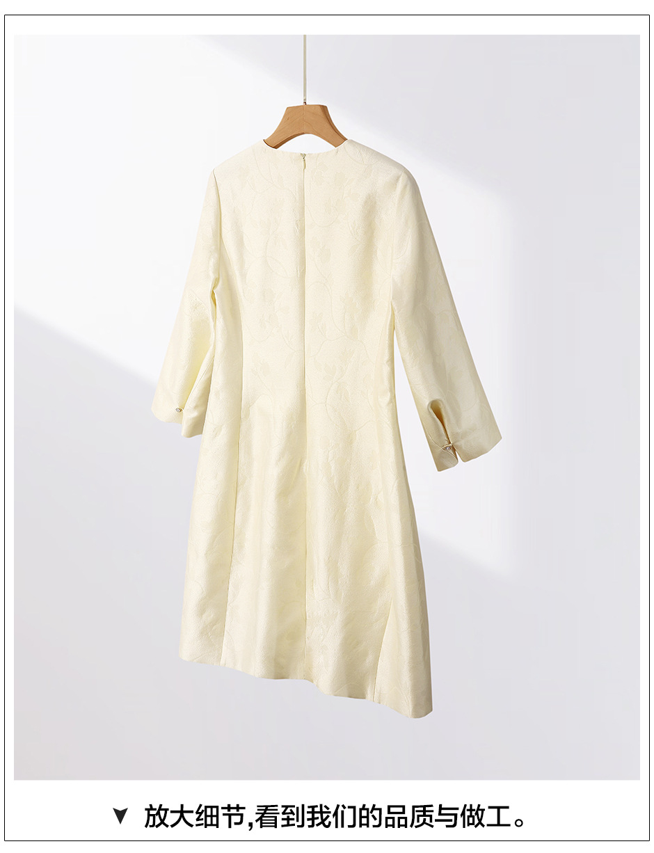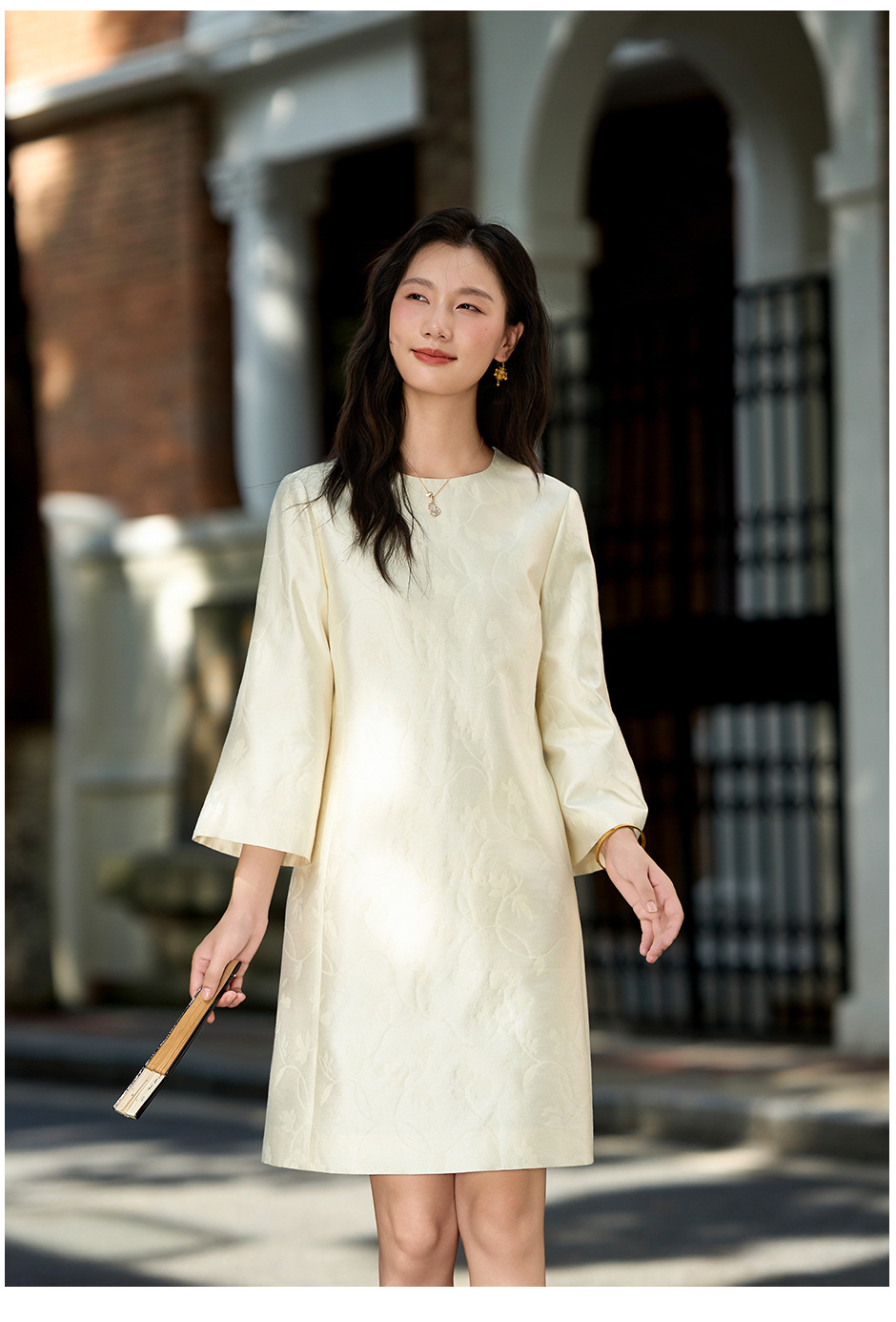 丁摩 秋冬丝毛混暗纹提花连衣裙 圆领九分袖中长款通勤百搭简约5ZF-76005
