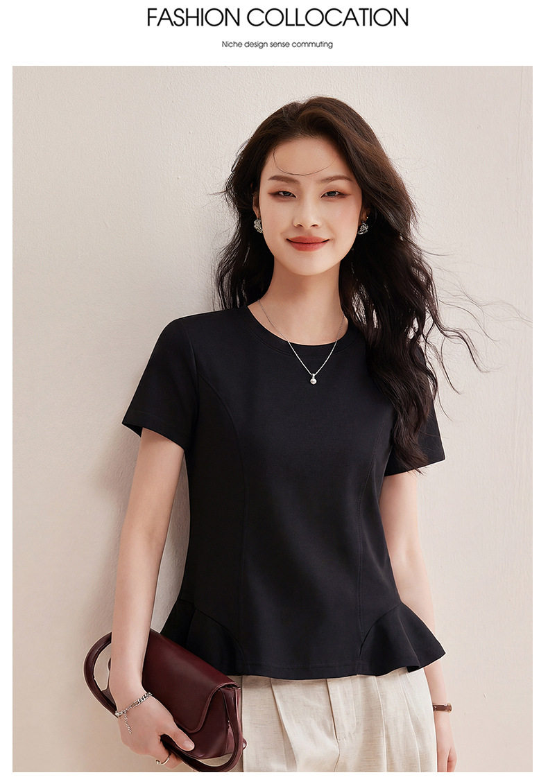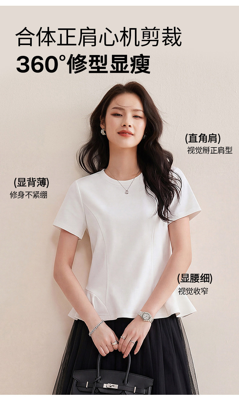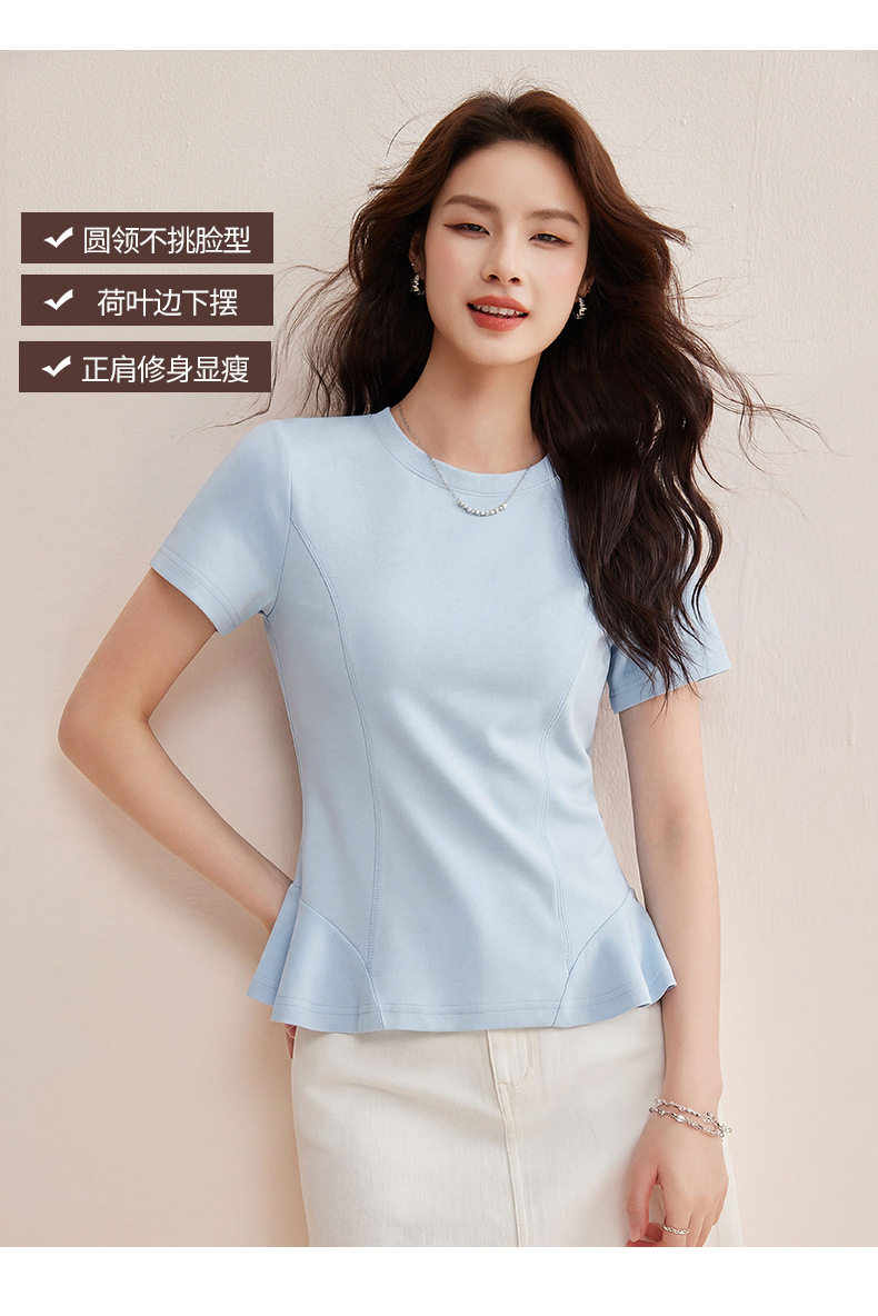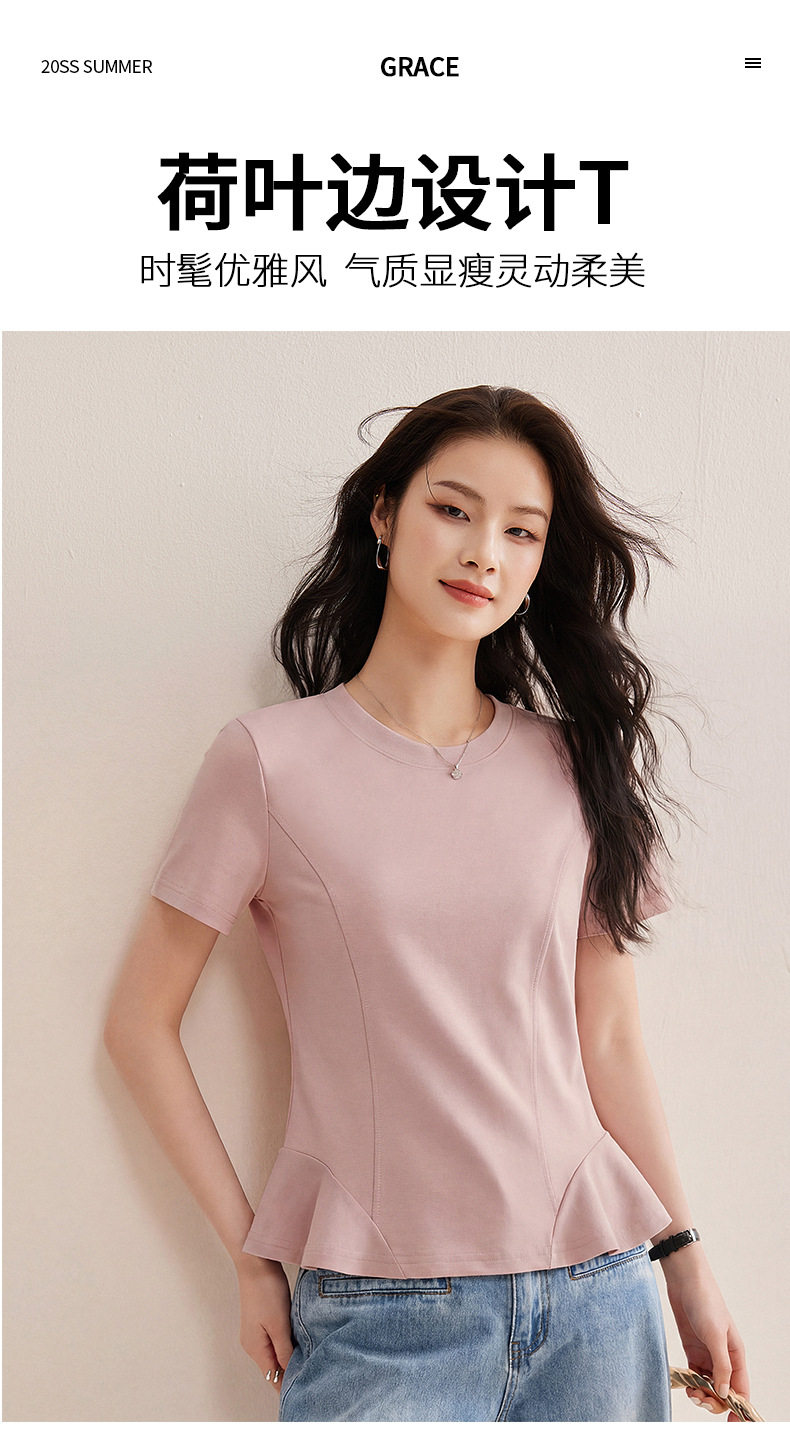 「自j」全新升级【铂金会员119/天猫159/差价40】(05142)洛诗琳拼接荷叶边云朵短袖上衣2026设计感薄款正肩显瘦T恤
