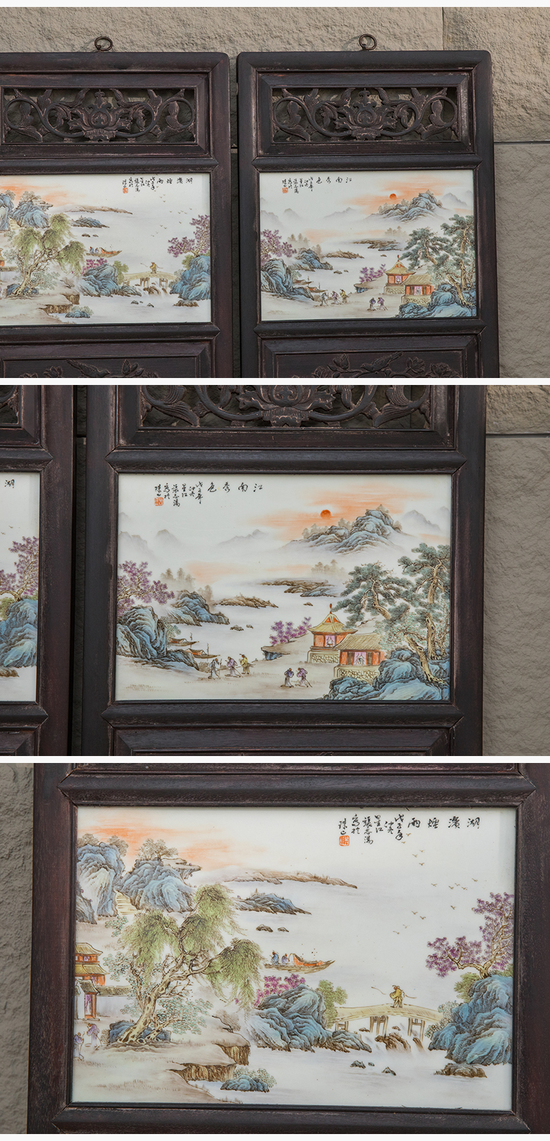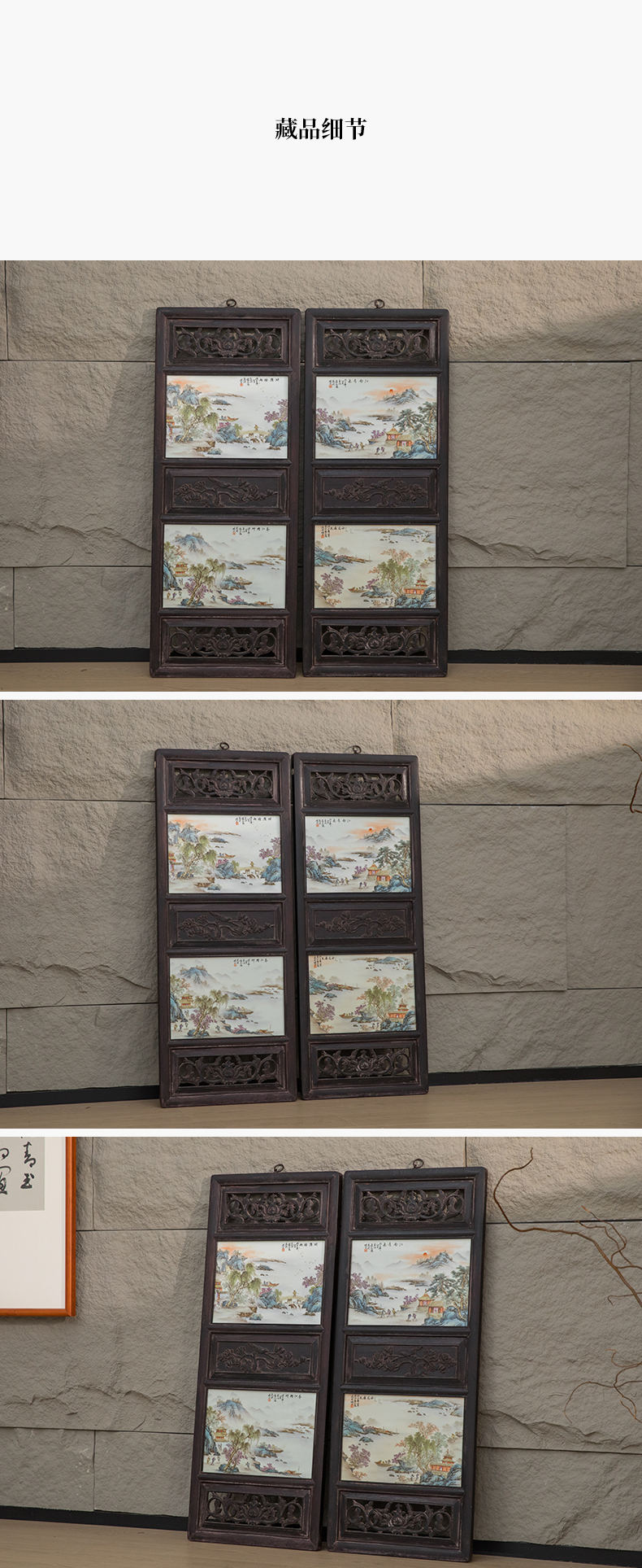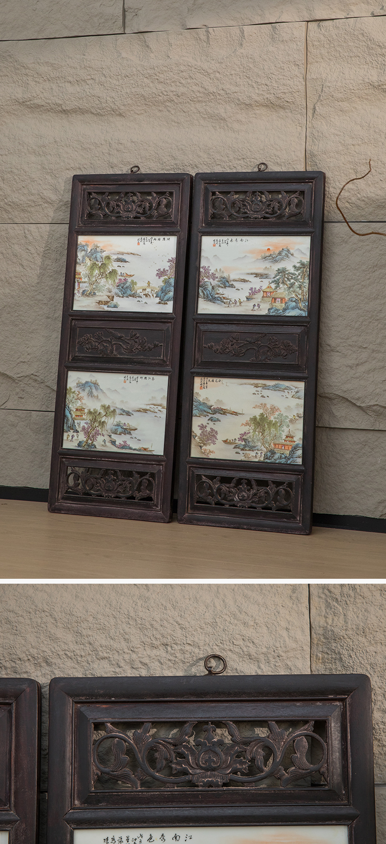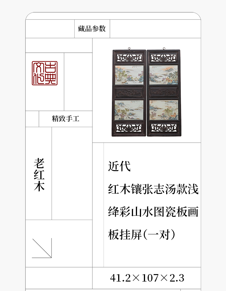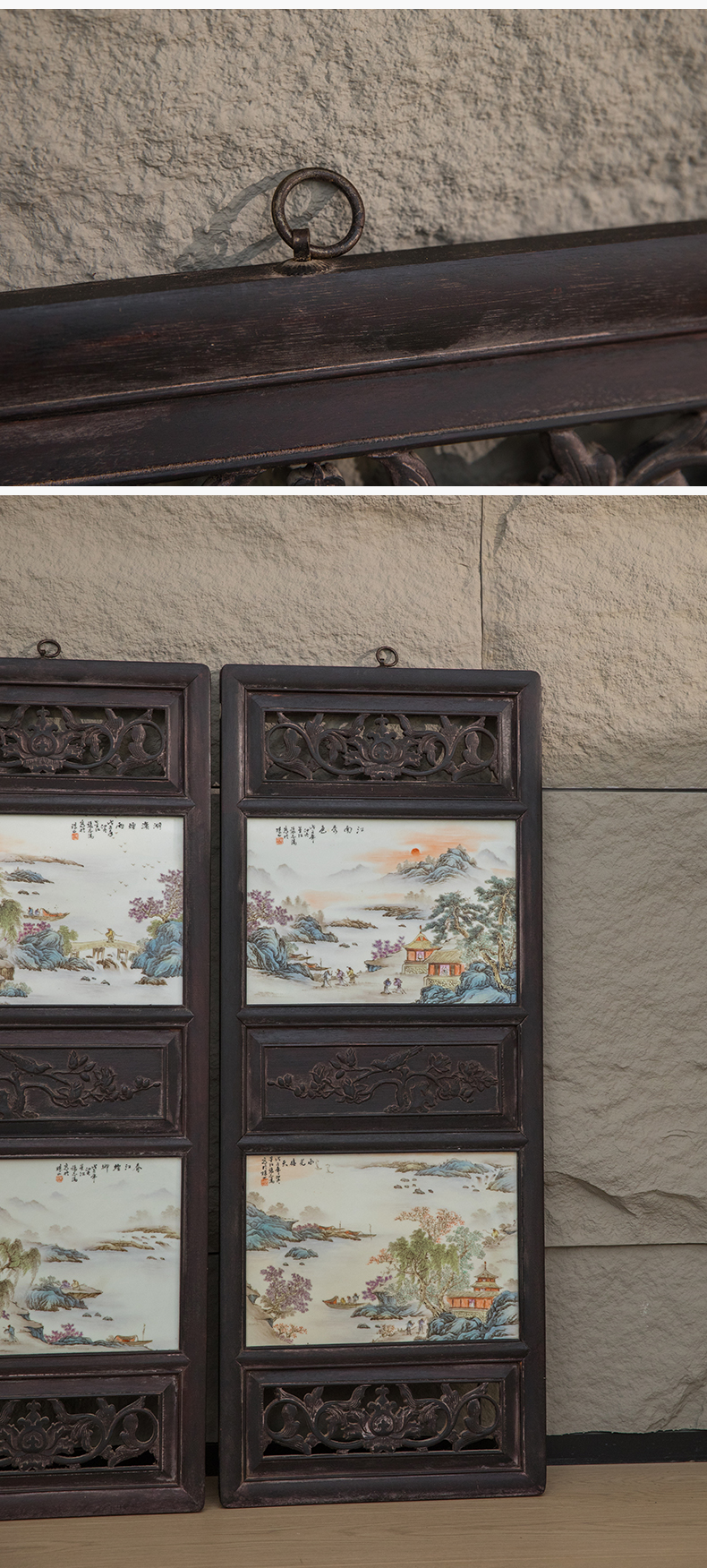 近代 红木镶张志汤款浅绛彩山水图瓷板画板挂屏(一对)