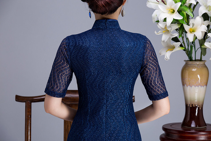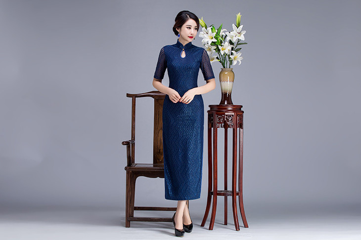 RY-9146日常复古,时尚高开衩礼服蓝色长款蕾丝旗袍