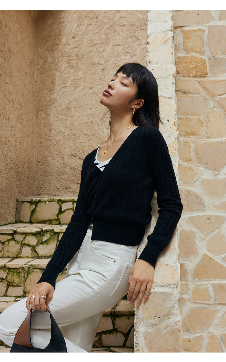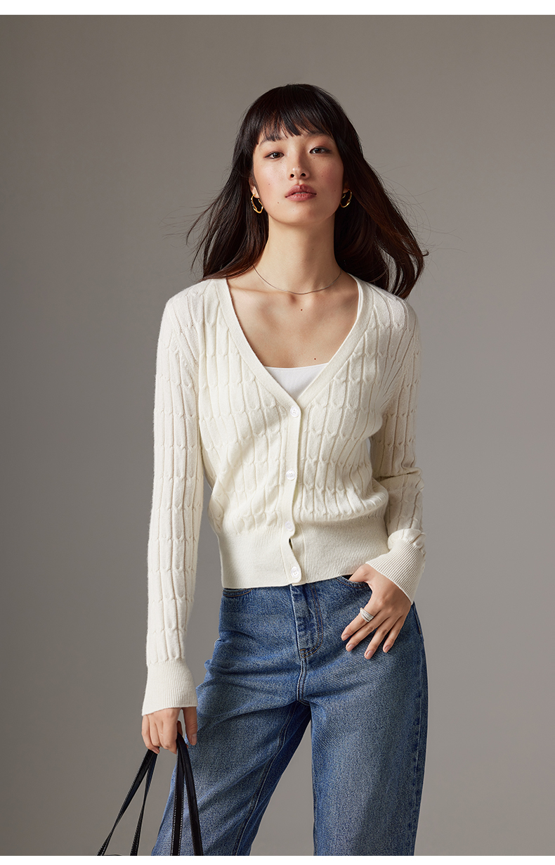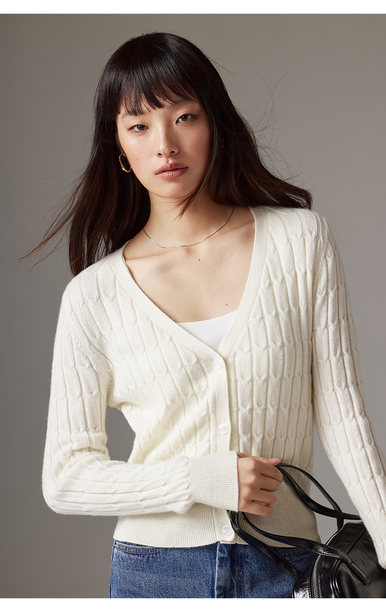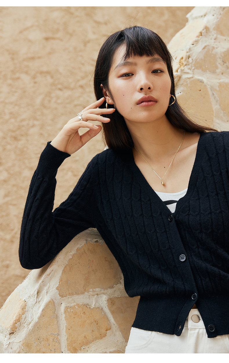 IN AND ON云柔感羊毛羊绒 复古绞花V领针织开衫53639
