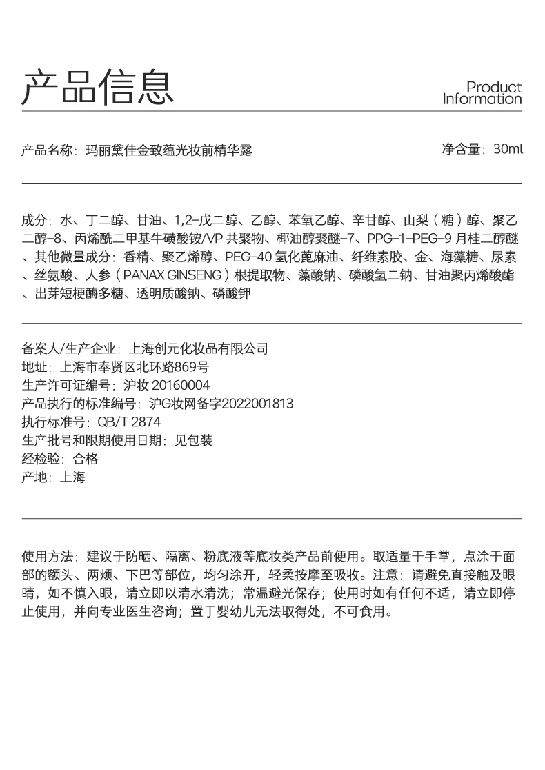 【积分兑换正装】玛丽黛佳 金致蕴光妆前人参精华露精华露保湿妆前凝露