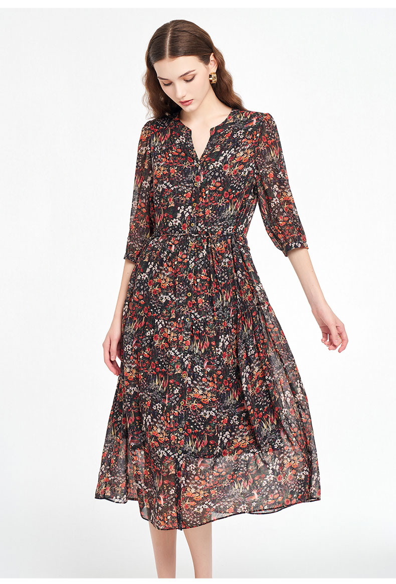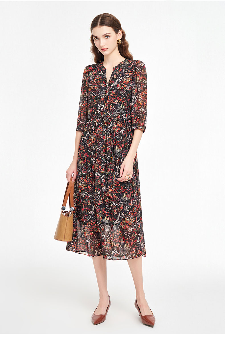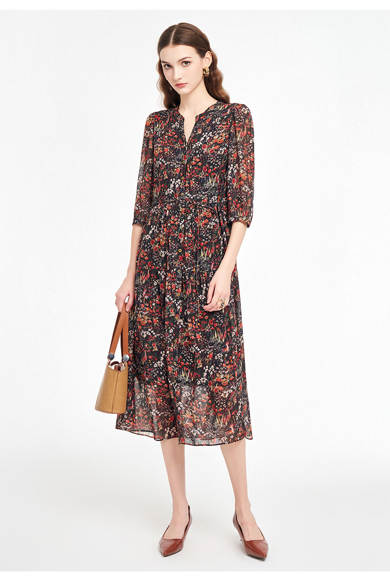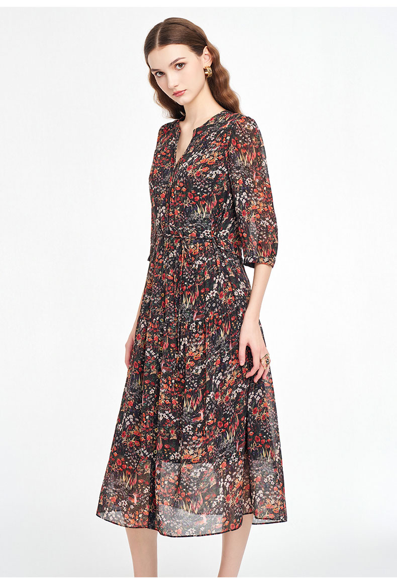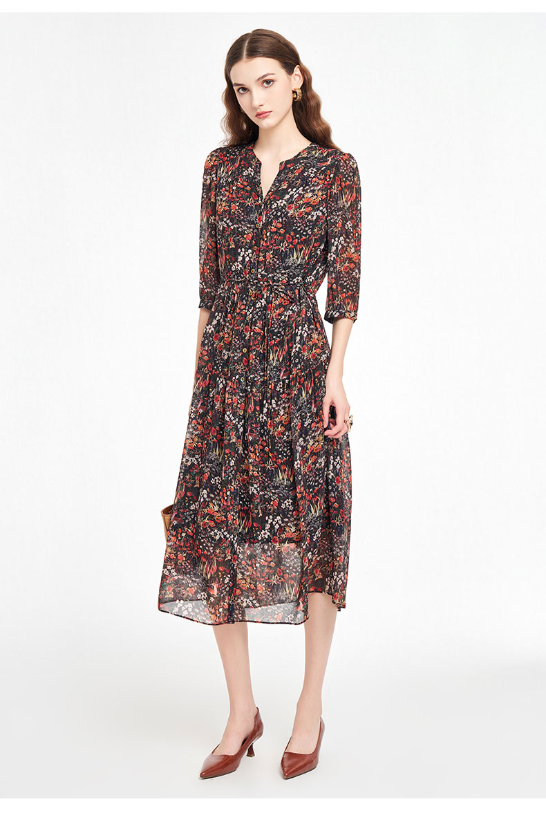 乔万尼新品2025秋V领收腰显瘦印花中长款连衣裙ED3E207