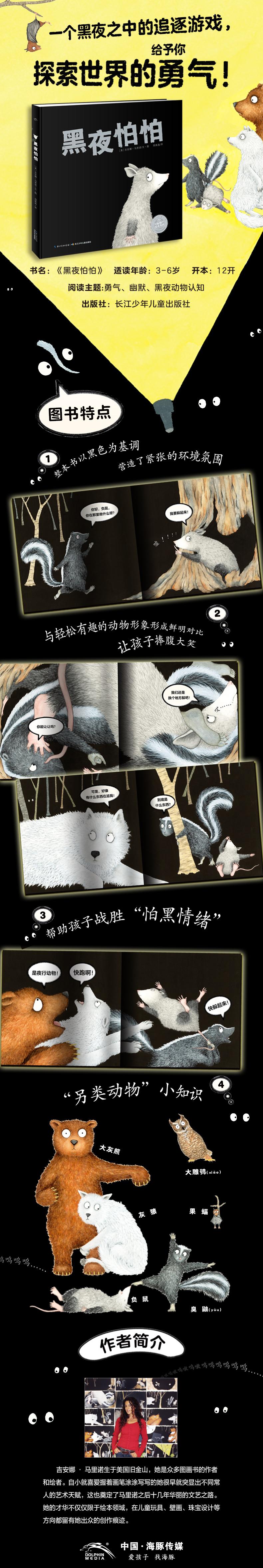 由美国吉安娜·马里诺所作图文、周高逸翻译的这本《黑夜怕怕》是一则由负鼠而引发的连环闹剧。胆小的负鼠总想象身后跟了一只看不见摸不着的怪物。于是臭鼬、大灰狼、棕熊纷纷跟着奔跑了起来。队伍越来越庞大,大家却越来越害怕,无边的想象力在漫漫黑夜恣意延伸……到底是长毛怪?大老虎?还是老鹰?快点瞪大眼睛跟着主角们一起寻找吧!这是一本表现力极为出色的绘本,充满各种巧妙的暗示性图画细节,培养孩子的观察能力和推理能力,幽默逗趣的表达方式,帮助孩子战胜“怕黑心理”。对怕黑和不敢一个人入睡的孩子来说是一场有趣好玩的情景喜剧;在马里诺轻松有趣的夜晚故事中,那些庞大凶猛的动物完全跳脱了固有的粗暴形象,臭鼬放“毒气”、负鼠装死都起到了风趣的视觉陪衬效果,连贯发展的故事情节也带来了连连不断的笑声;故事前的“夜行动物”小提示,给孩子普及动物小知识;简短有趣的对话形式,贴近儿童生活 可用于角色扮演,是一本非常适合亲子阅读的好......