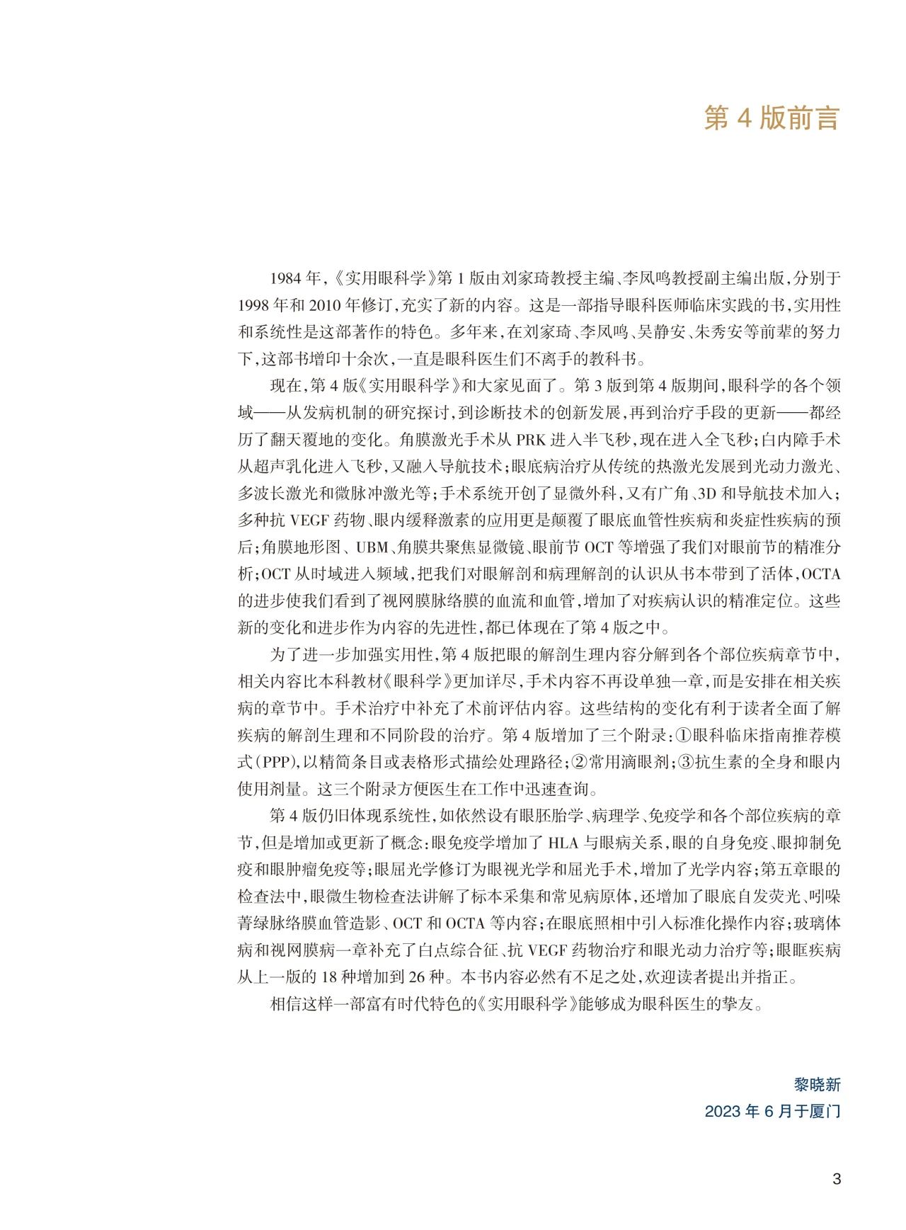 第4版《实用眼科学》依然设有眼胚胎学、病理学、免疫学和各个部位疾病的章节,增加或更新了概念:眼免疫学增加了HLA与眼病关系,眼的自身免疫、眼抑制免疫和眼肿瘤免疫等;眼屈光学修订为眼视光学和屈光手术,增加了光学内容;眼的检查法中,眼微生物检查法讲解了标本采集和常见病原体,还增加了眼底自发荧光、吲哚菁绿脉络膜血管造影、OCT和OCTA 等内容;眼底照相中引入标准化操作内容;玻璃体病和视网膜病补充了白点综合征、抗 VEGF 药物治疗和眼光动力治疗等;眼眶疾病从上一版的 18 种增加到 26 种。