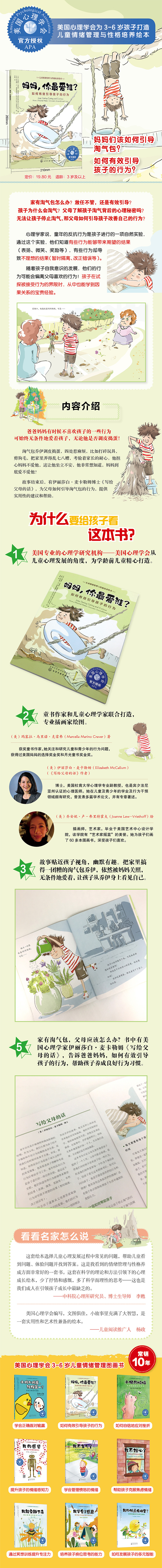 绘本中附有美国心理学家伊丽莎白·麦卡勒姆博士《写给父母的话》,从心理学角度剖析了儿童的反抗行为,并就父母如何有效引导孩子的行为,帮助孩子养成良好的行为习惯提供了一系列实用性建议。
