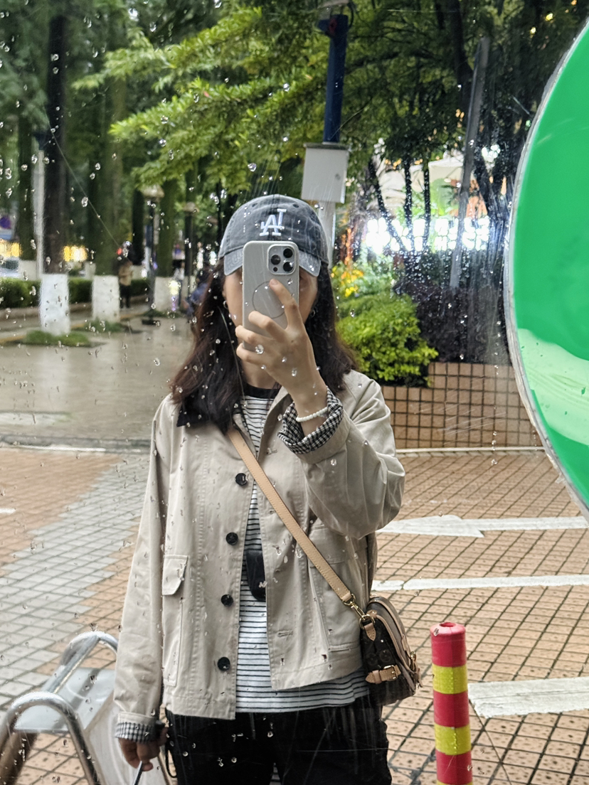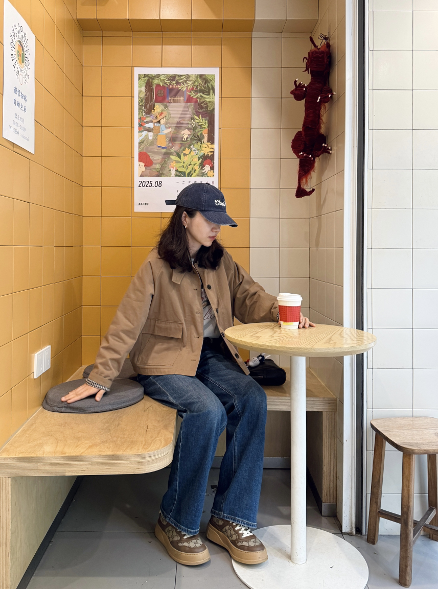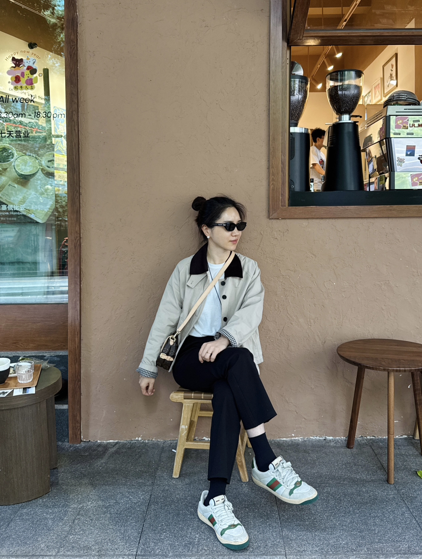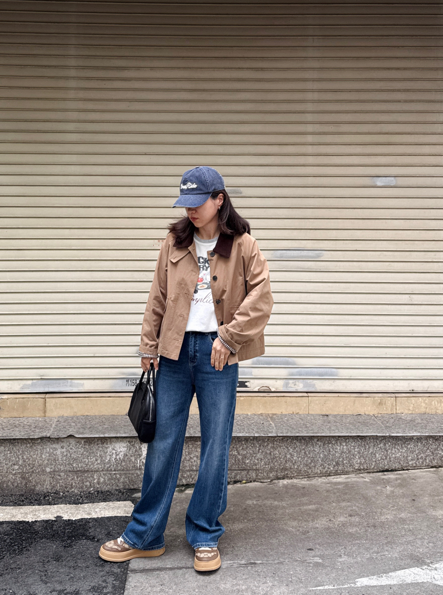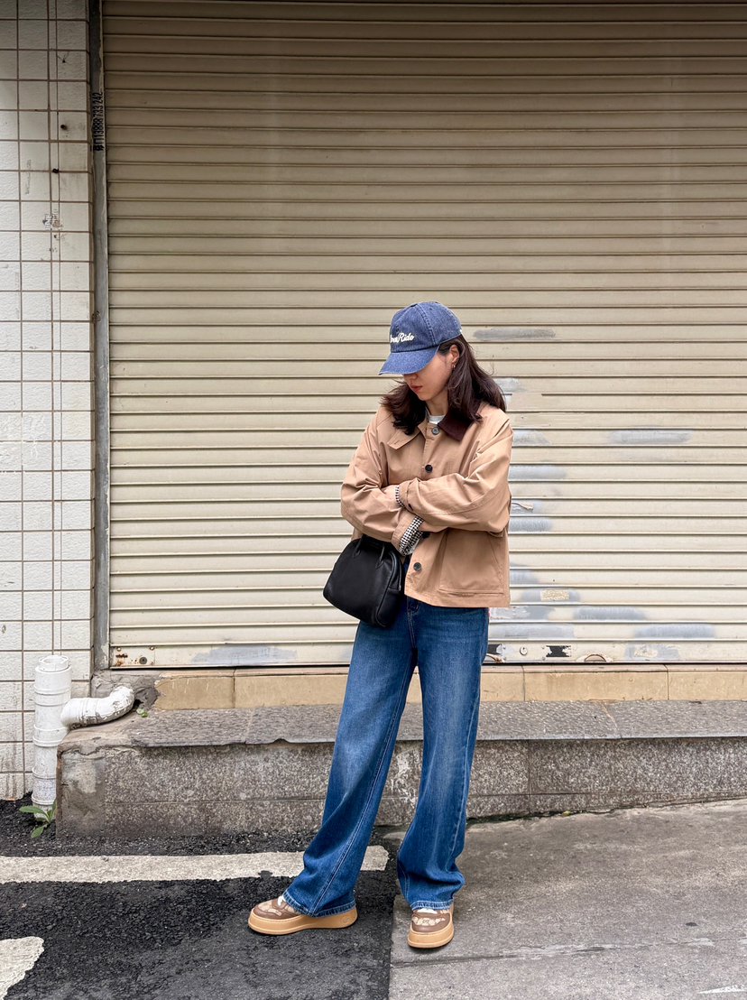 偏短的风衣,正常上衣长度,搭配牛仔直筒裤非常显高!