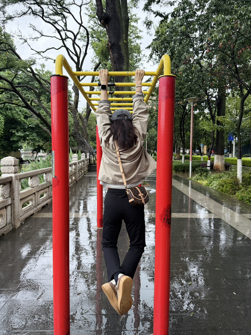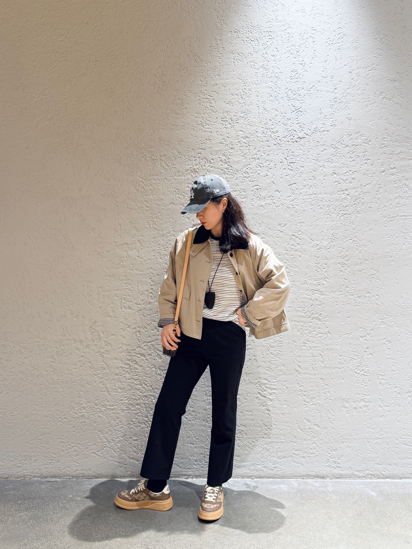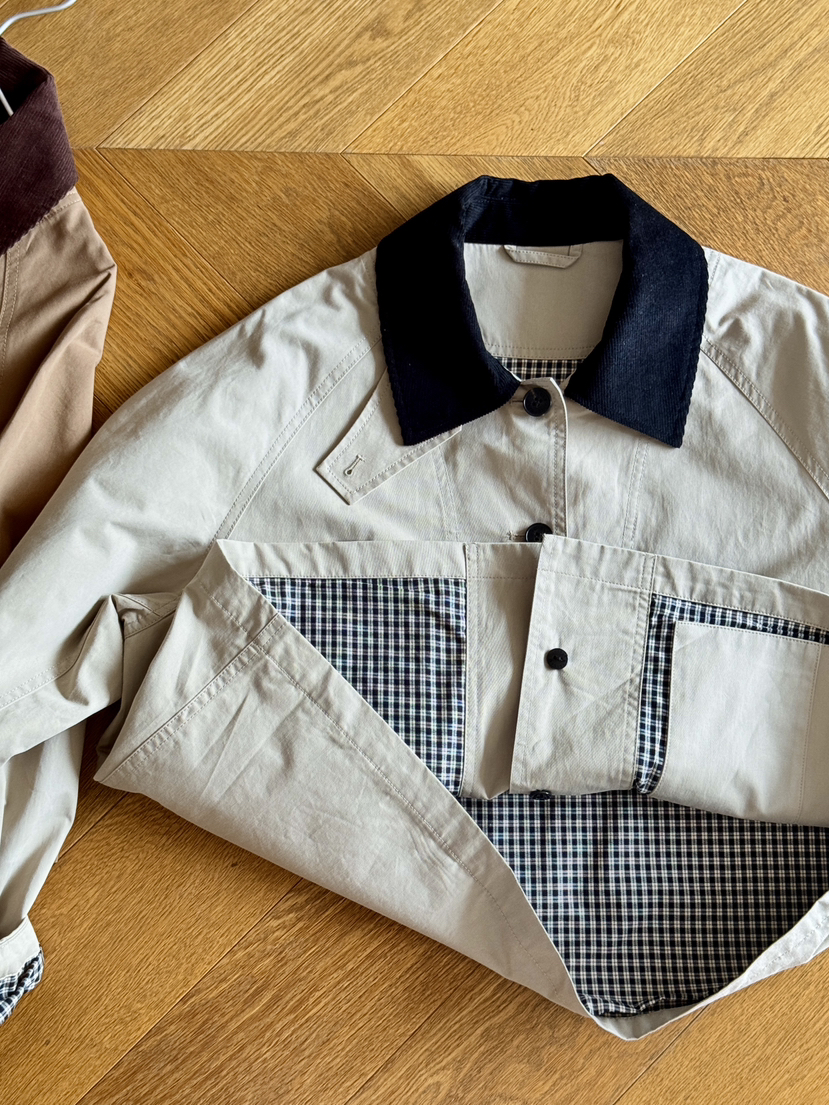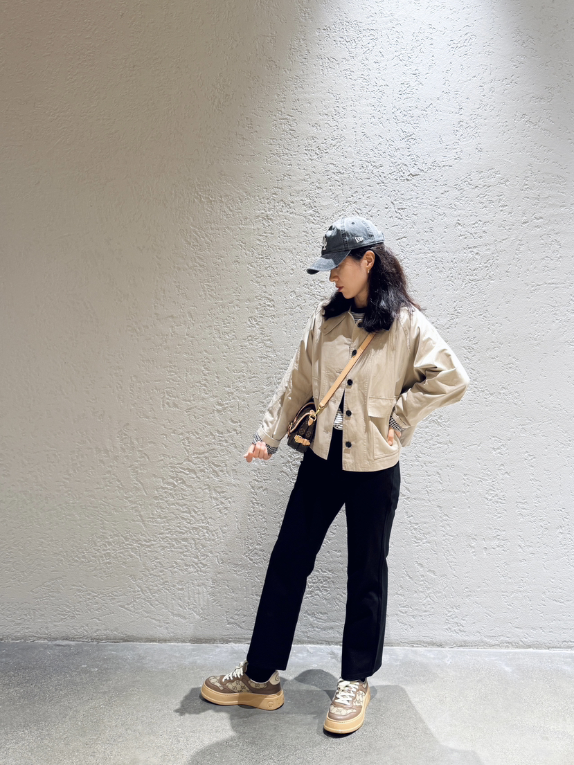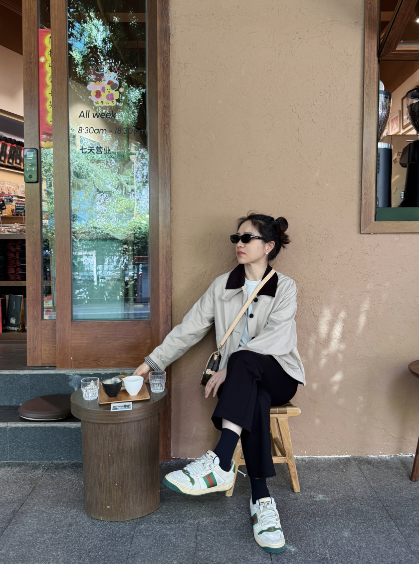 偏短的风衣,正常上衣长度,搭配牛仔直筒裤非常显高!