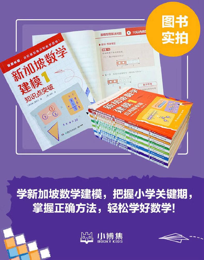 《新加坡数学建模3》,适合小学3年级学生,包括一本《知识点突破》和一本《应用题专项》。《知识点突破》有讲有练,对接小学课标,从具象-形象-抽象,一步步帮孩子理解数学概念,完成从具象思维向抽象思维的过渡,掌握加减乘除四则运算混合应用、正方形的周长和面积等知识。《应用题专项》分册,专门针对小学数学应用题,用画图解题的方法理顺思路、详细讲解解题步骤,不管多复杂的题目都能迎刃而解。不仅有多种常见题型,还设置了“有一定难度”的题目,举一反三。两本书可同步配套使用,不知不觉学会各种模型图,逐渐形成和完善抽象的数学思维能力。