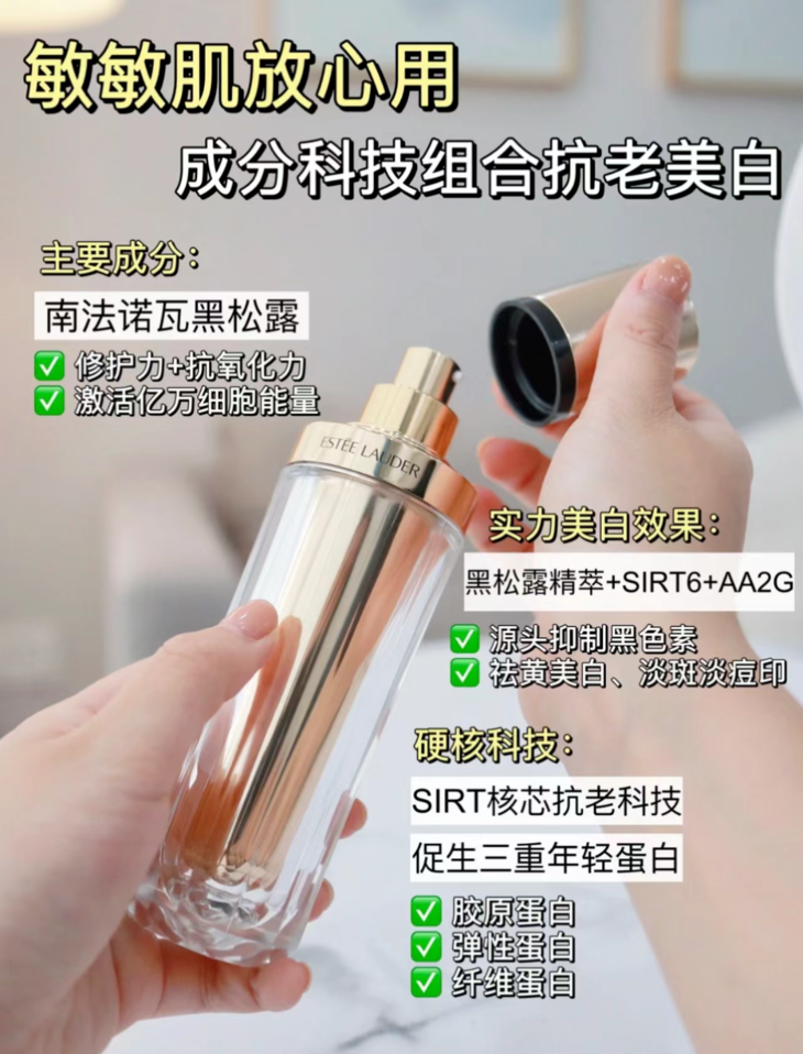 👑雅诗兰黛黑松露精华30ml 🙌【主打】:修护+抗老+提亮,抗老真的一点也不含糊! ✅【主要成分】:南法诺瓦黑松露,主要就是:抗敏修护 🧬【硬核科技】:SIRT核心抗老科技、促生三重年轻蛋白 ✨质地轻盈,流动也不错,多次叠加或者叠加面霜也不搓泥 💥敏感肌也能用~