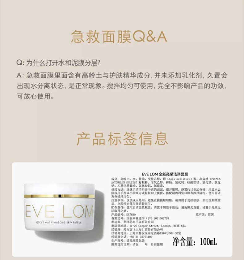 EVE LOM 拯救奇迹面膜 100ml 祛黄亮肤退红 强力祛痘 净油 青春期痘痘亮采面膜