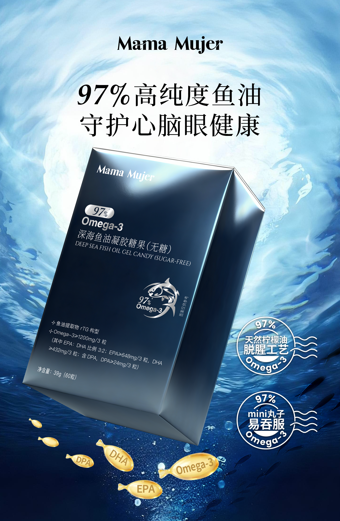 Mama Mujer 秘鲁Y疗级鱼油 97%高纯度 EPA 血管炎老化 降甘油三酯 降TG脂标 抗硬化稳斑块 手脚冰冷发麻 心慌胸闷 血脂高 DHA 60粒/盒 MMMJ 国内发货