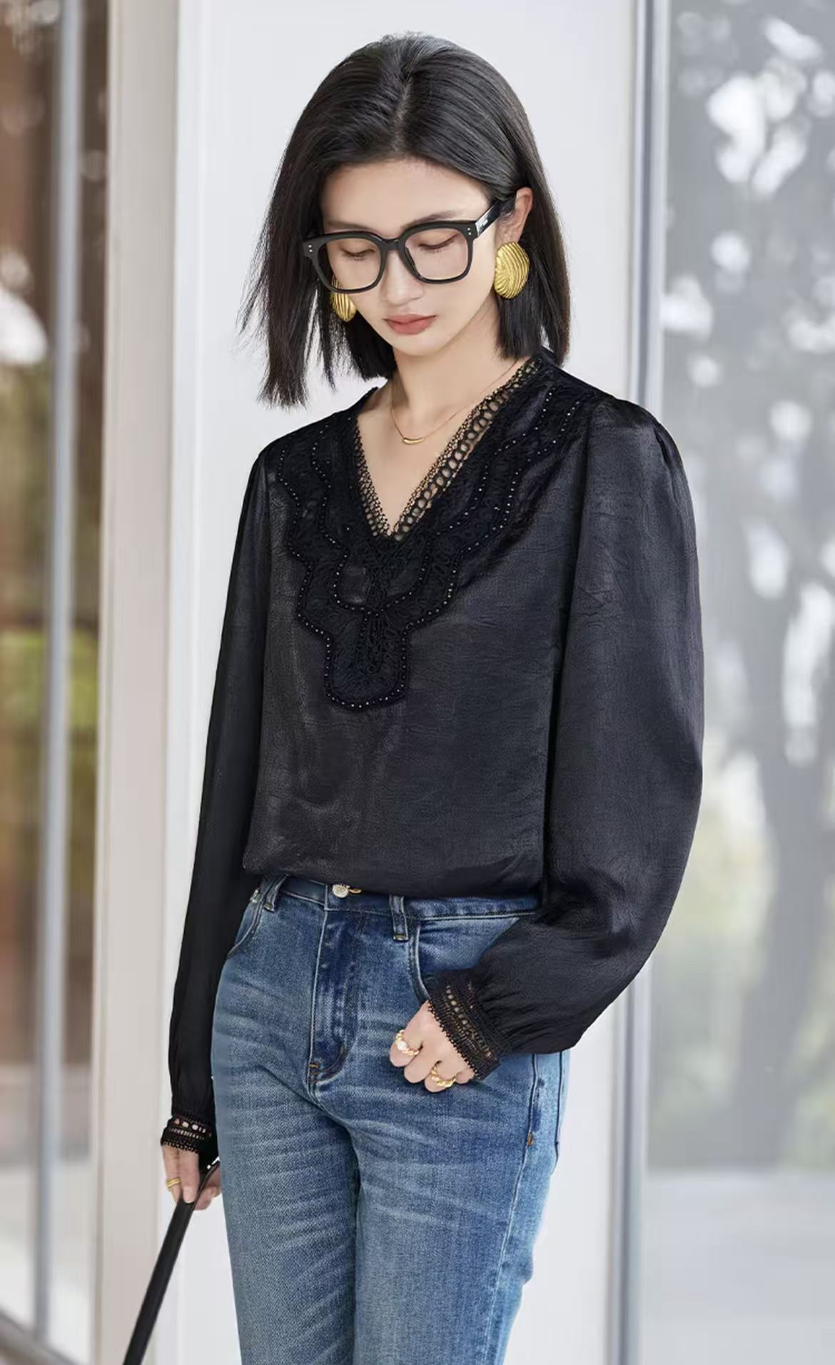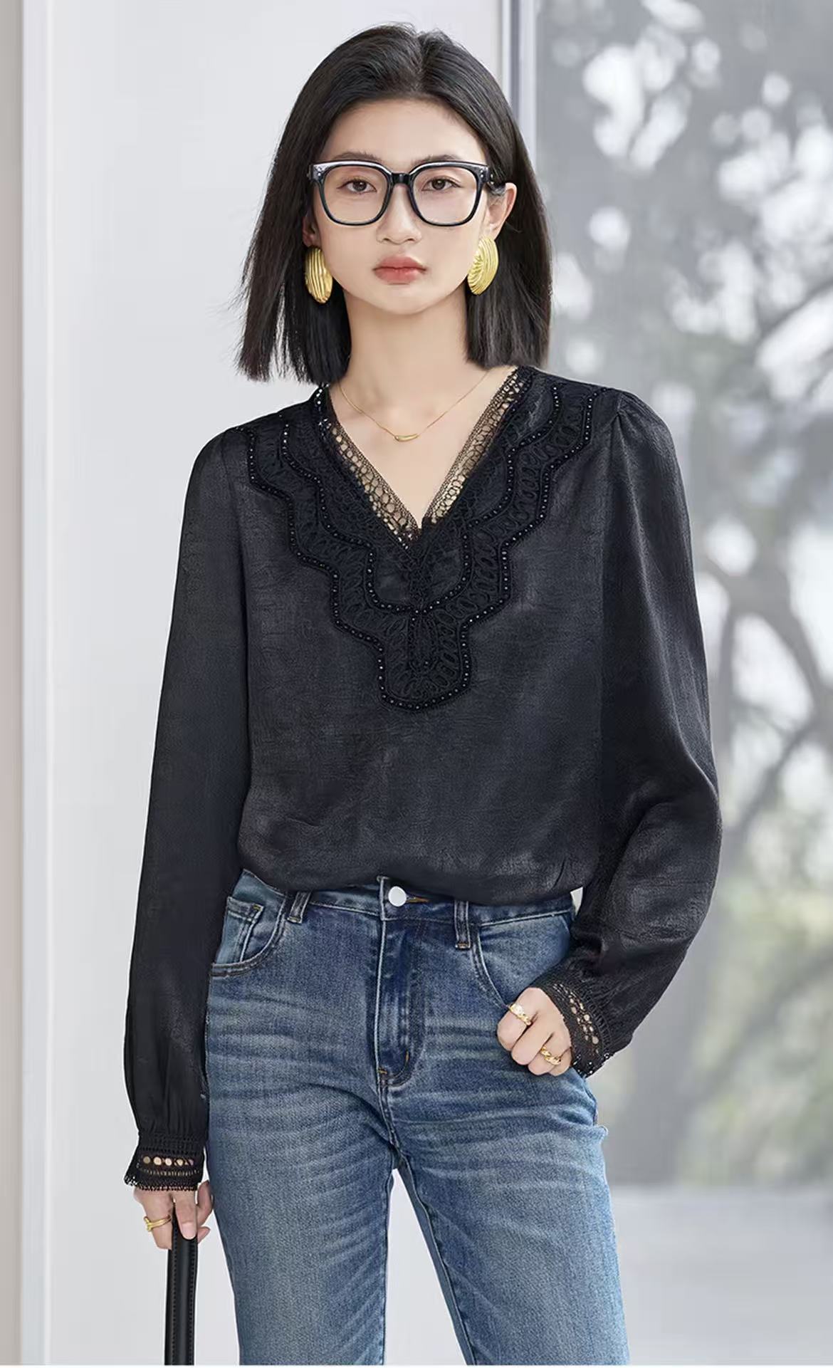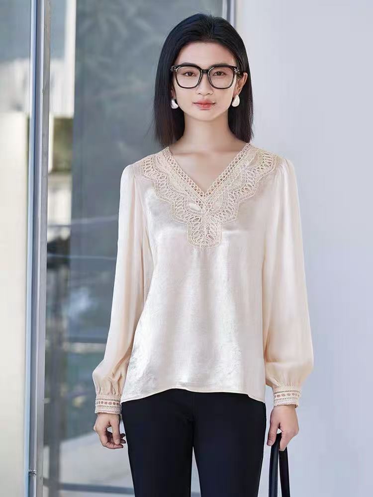 手工钉珠【秋上新】2636丝滑光泽顺滑手抓纹缎面长袖衫-喜出