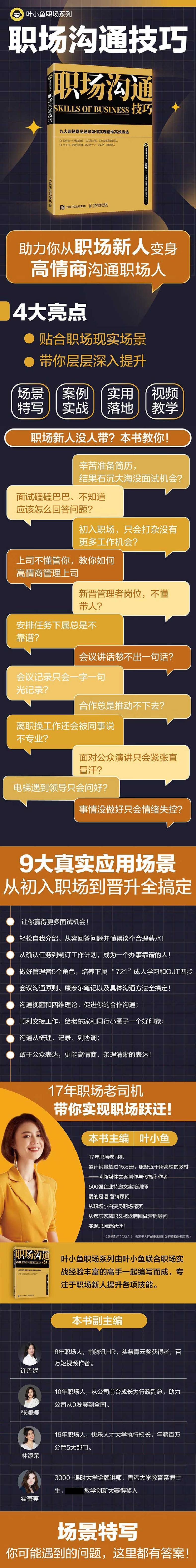 2.运用场景更符合大学生,内容有:简历沟通、面试沟通、向上管理、向下管理、会议沟通、合作沟通、工作交接、职场沟通技能提升、职场情商。从找工作,入职面试、工作交接,成为管理者等具体场景,均有涉及。