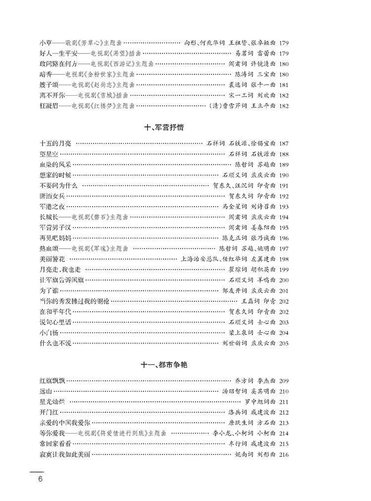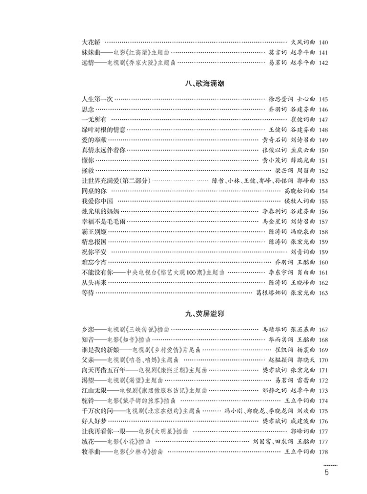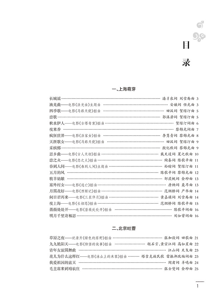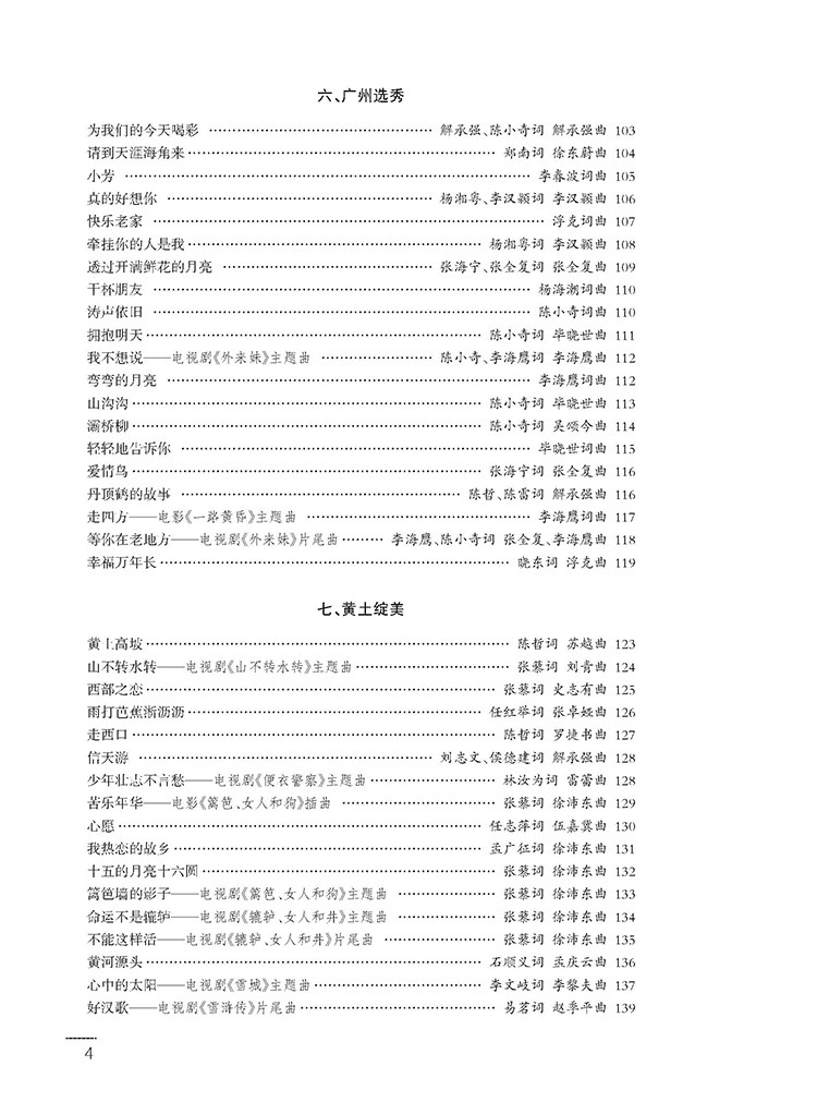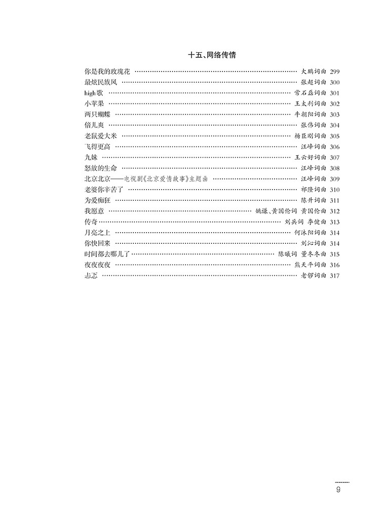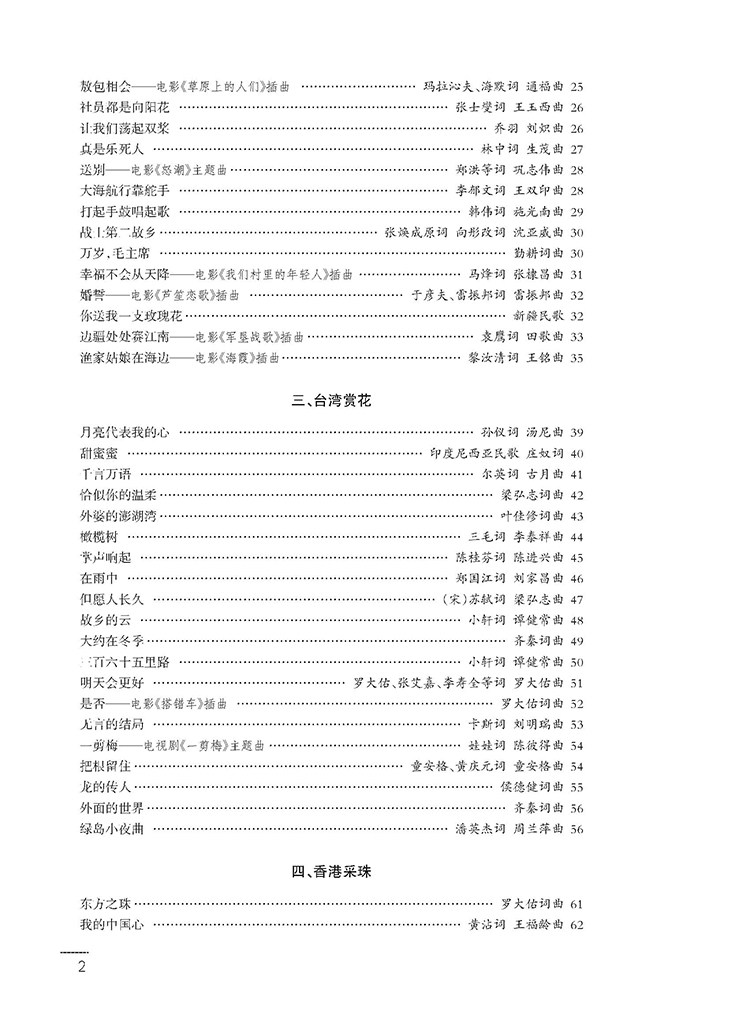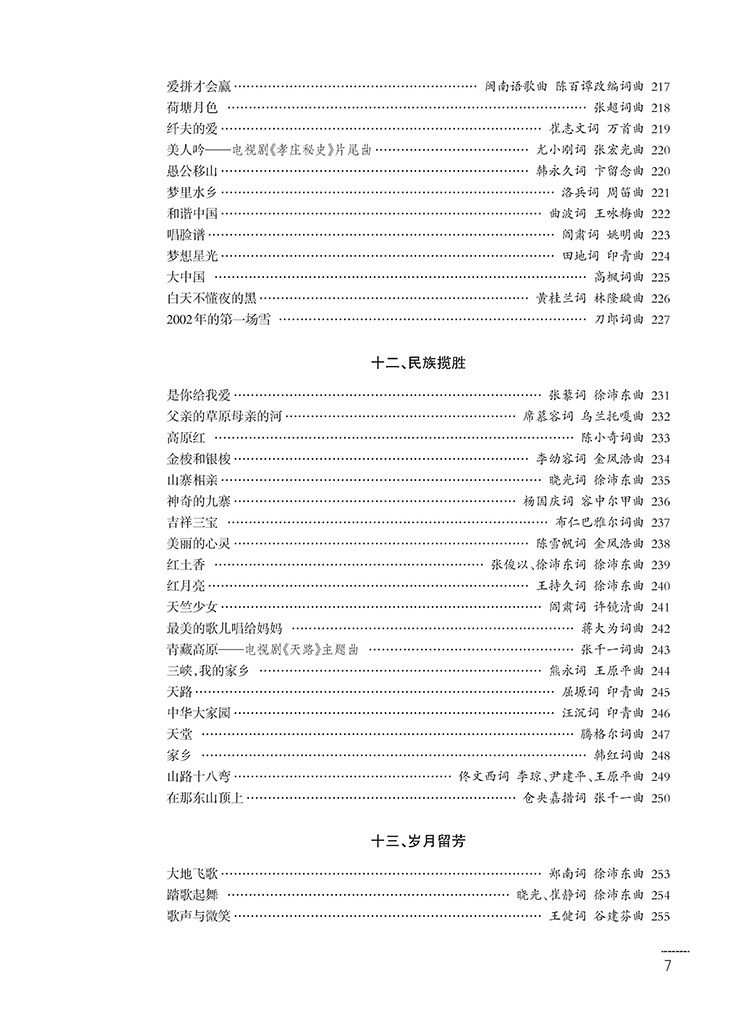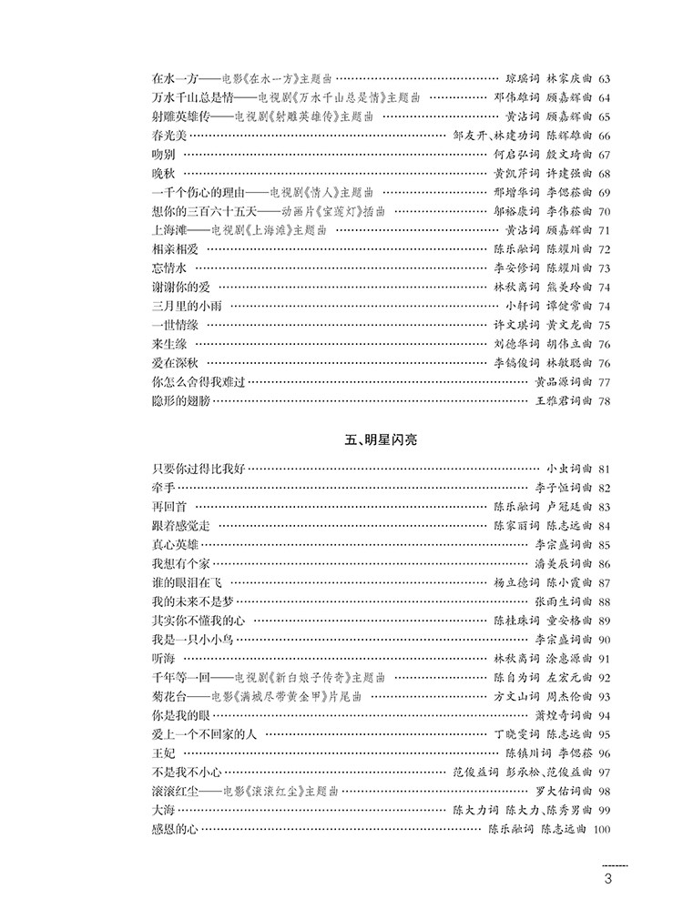 300首作品由15个栏目构成,分别为:上海萌芽、北京吐蕾、台湾赏花、香港采珠、广州选秀、明星闪亮、黄土绽美、歌海涌潮、荧屏溢香、军营抒情、都市争艳、民族揽胜、岁月留芳、晚会撷英、网略传情,每栏均精选20首代表作品,如上海萌芽里的《夜上海》《五月的风》《明月千里寄相思》等,北京吐蕾里的《青年友谊圆舞曲》《毛主席来到咱农庄》等,台湾赏花里的《月亮代表我的心》《恰似你的温柔》等,香港采珠里的《我的中国心》《万水千山总是情》等,广州选秀里的《请到天涯海角来》《丹顶鹤的故事》等,明星闪亮里的《我想有个家》《明明白白我的心》等,黄土绽美里的《我热恋的故乡》《信天游》,等等。全部作品是编者充分考虑歌曲在不同时期的突出贡献,歌词和旋律方面的优秀品质,各种不同流行唱法的标志性名歌和尖峰之作,及歌曲在歌迷心中的反响程度等综合特点后遴选而出。前5个栏目基本按时间排序,后10个栏目大致按块状排序,从整个栏目的布局既能看出流行歌曲的发展轨迹,又能看出有关地域、传媒、群体的贡献性。