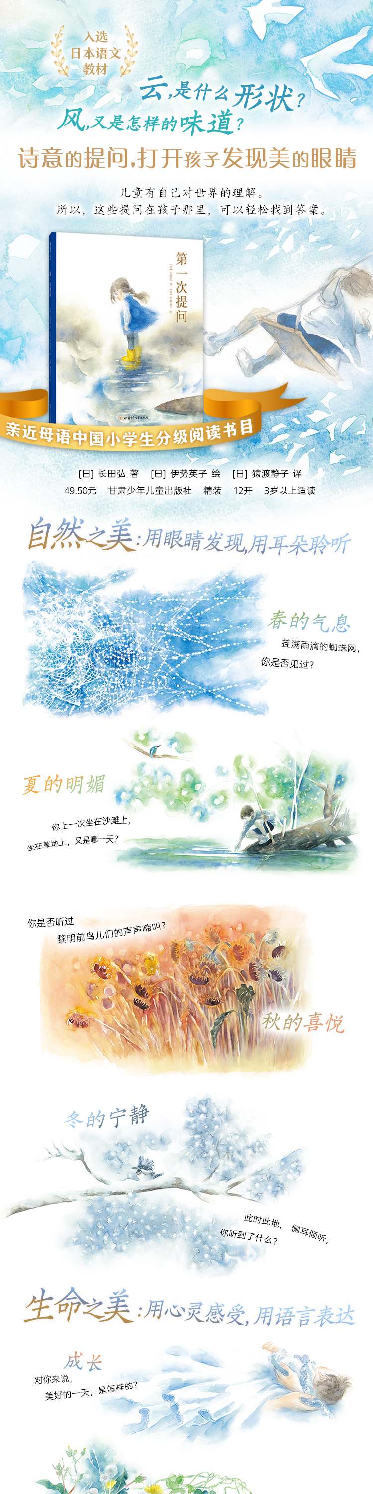 诗人长田弘用三十个诗意的提问,引领小读者发现自然之美、生命之真;画家伊势英子以清灵悠远的绘画,配合涓涓流淌的诗句,就宛若两种乐器的精彩合奏。本书在日本出版后引起轰动,入选了小学语文教科书,并被誉为“触动心灵的美绘本”。