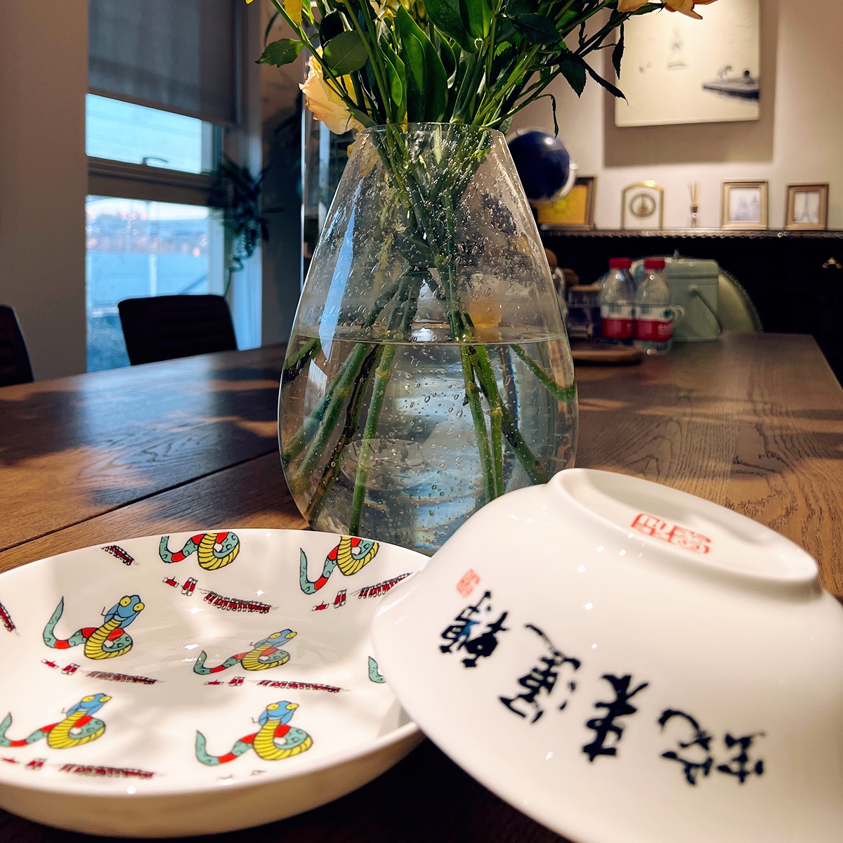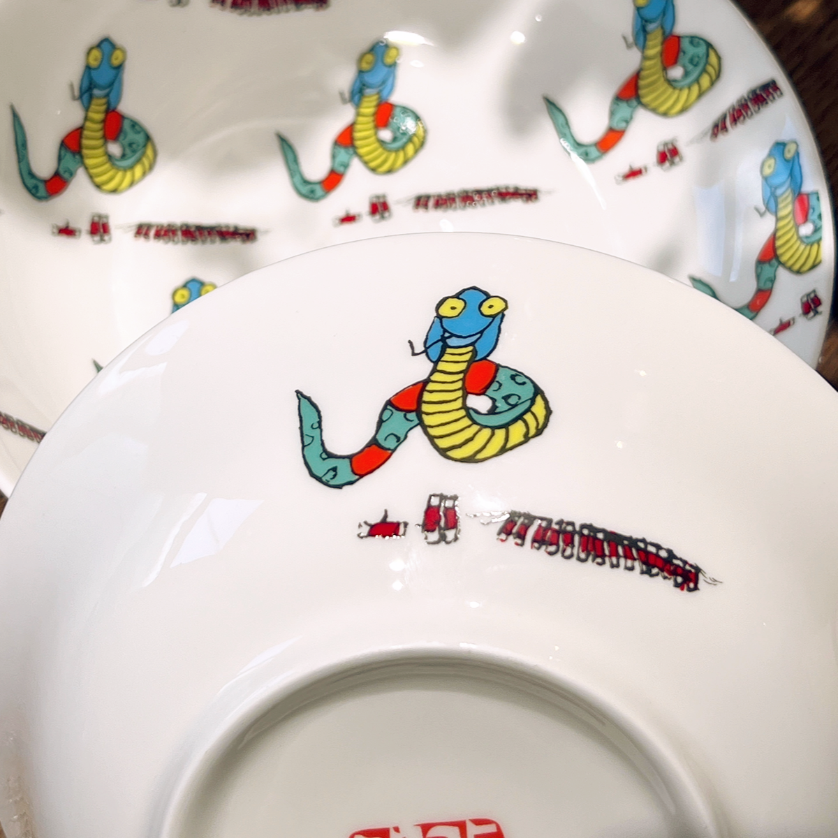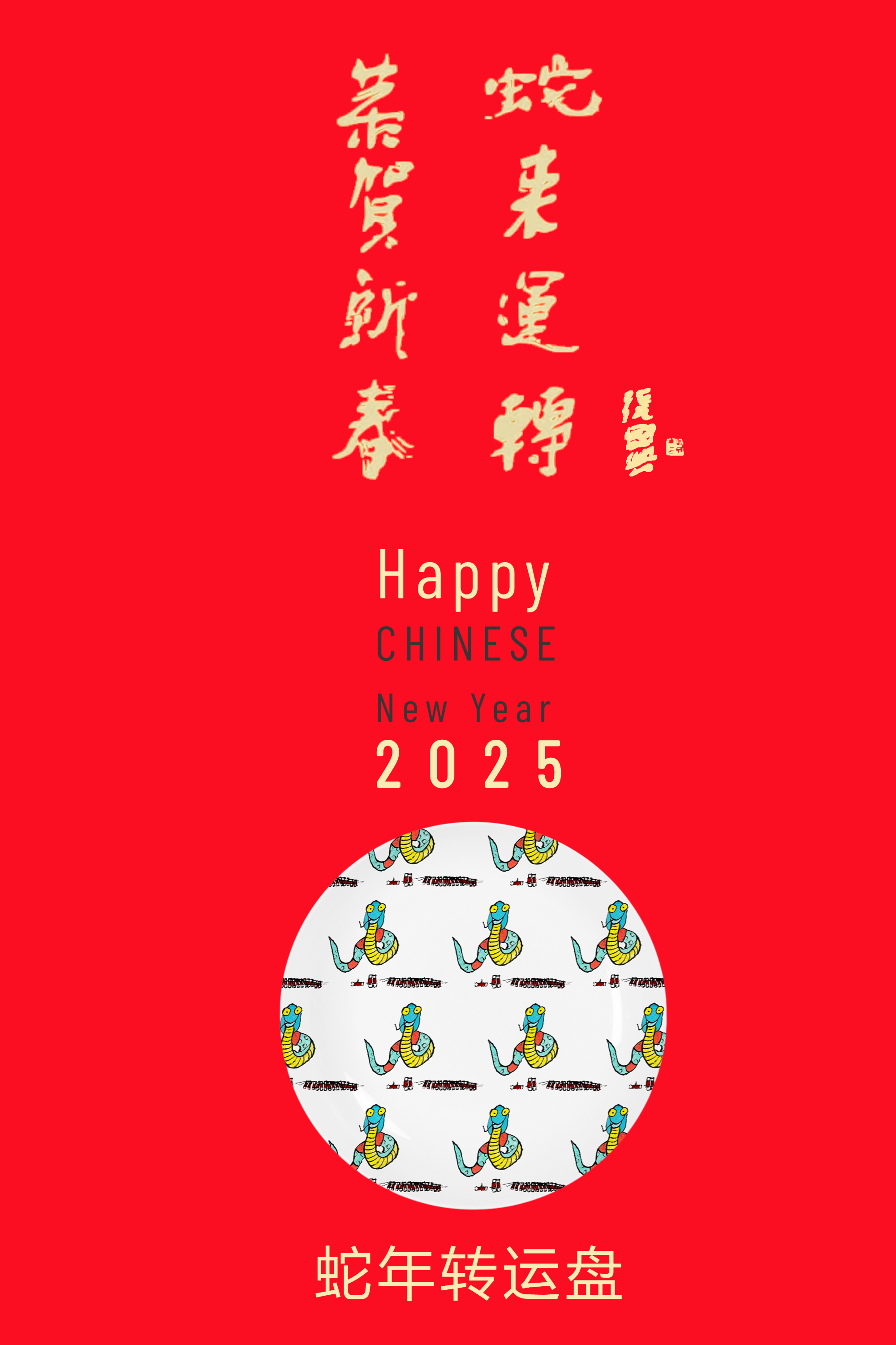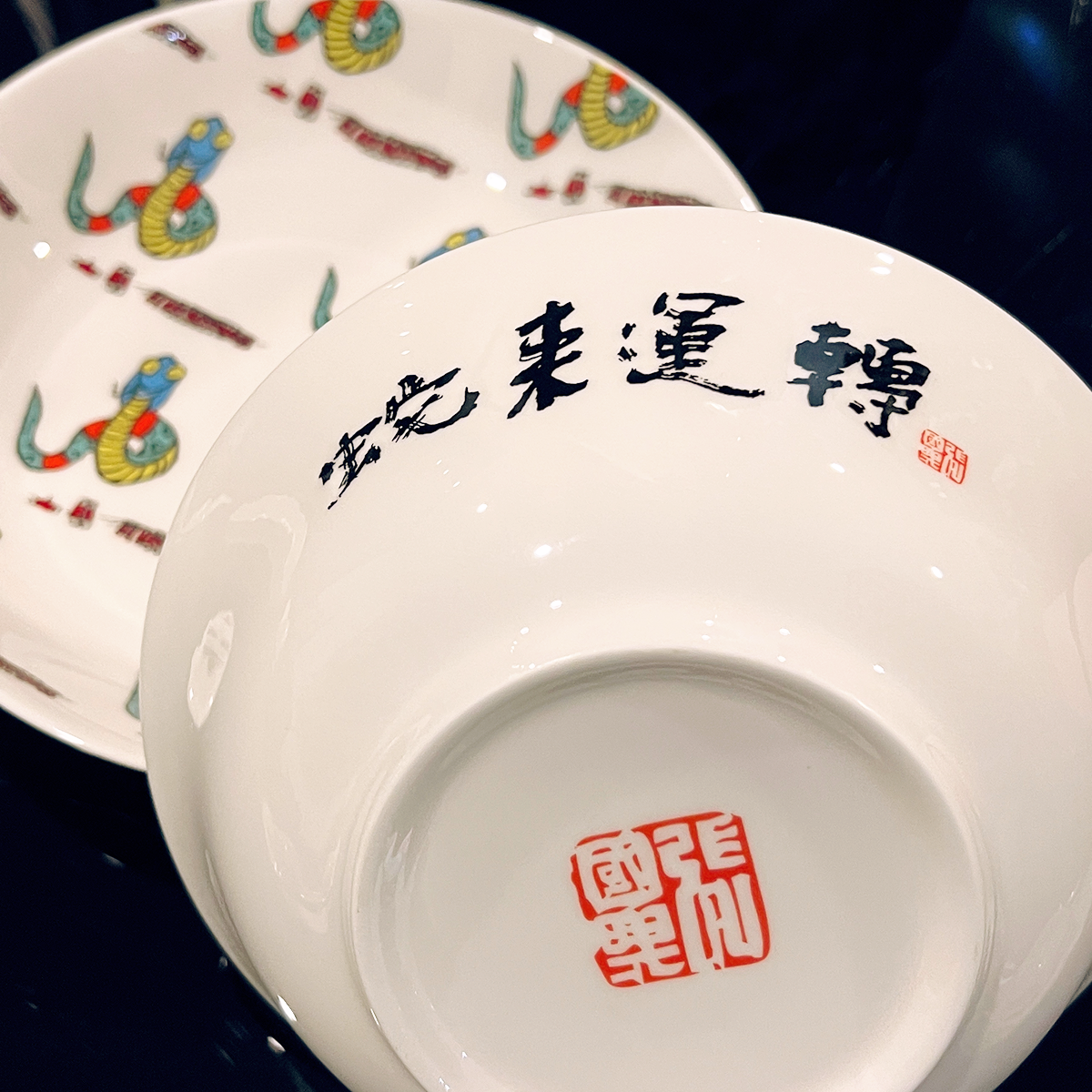 我们将张国兴先生的“蛇来运转”图与景德镇陶瓷一起烧制,限量发行“蛇年转运碗”和“蛇年转运盘”。
