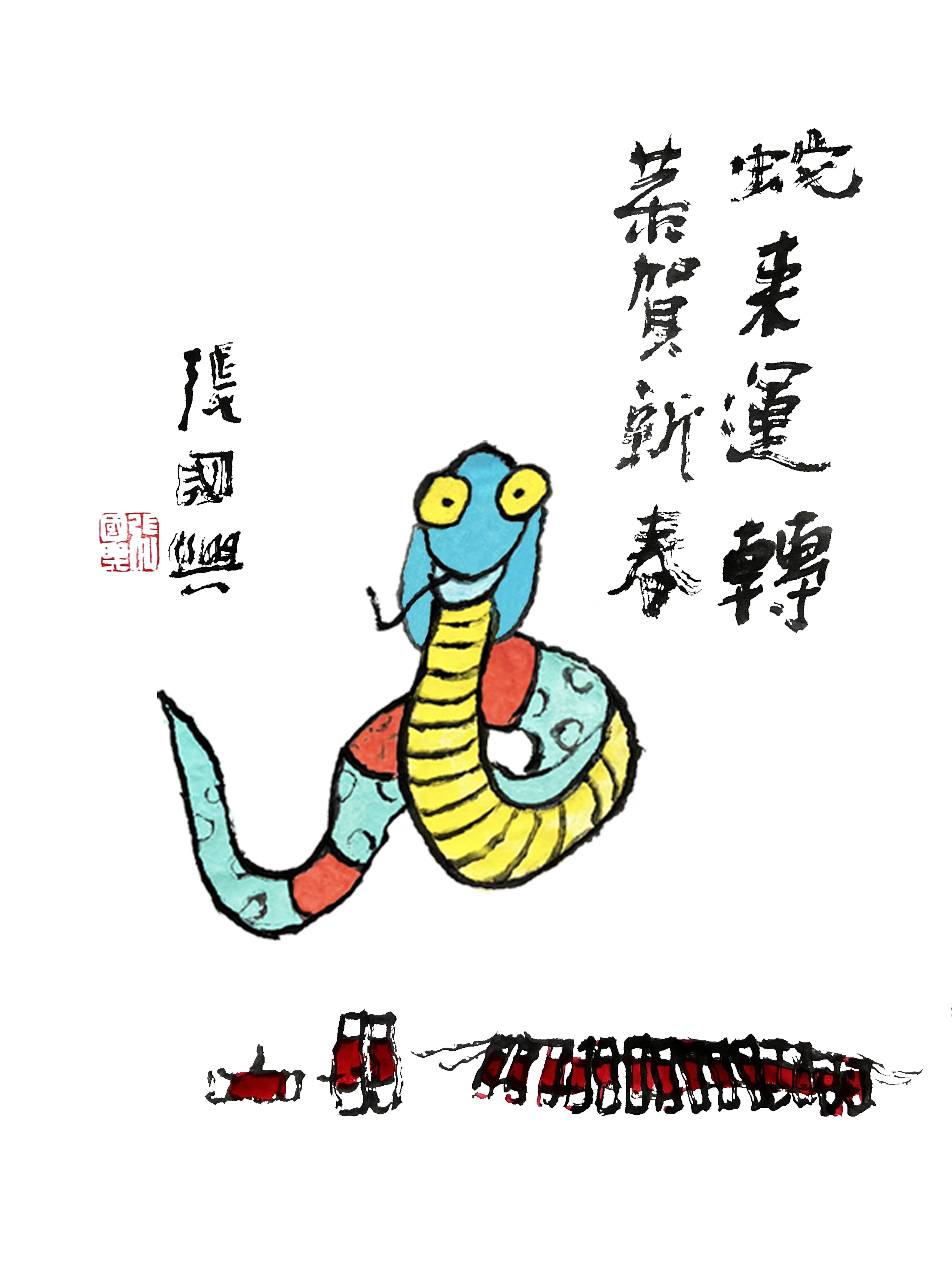 张国兴老师以成熟老辣的中国画传统技法,结合民族色彩运用,将蛇的形象童趣诙谐呈现,融入生活哲学 ,创作了这幅年味儿十足的《蛇来运转》图。