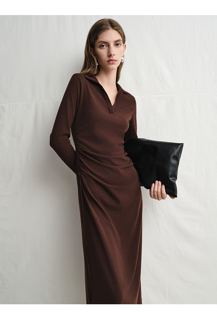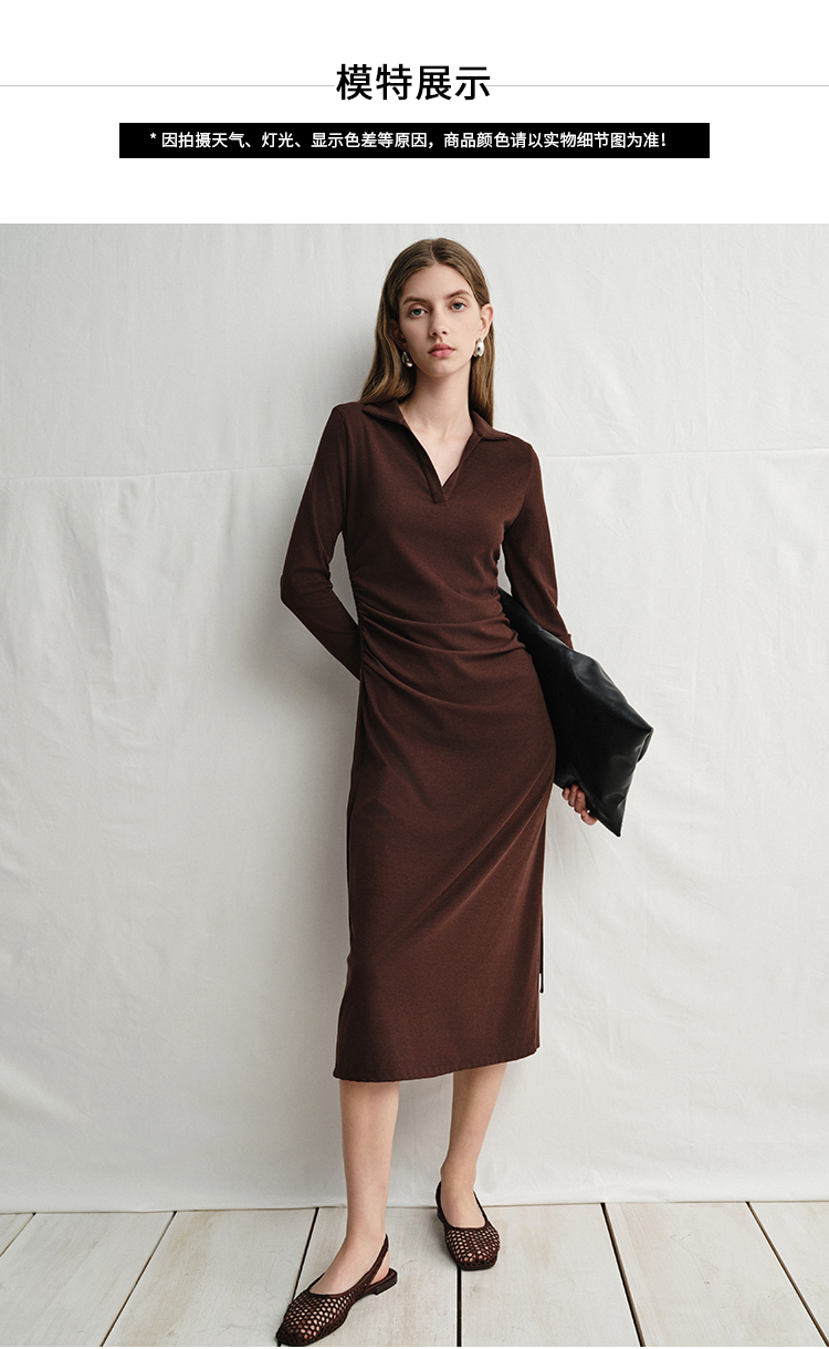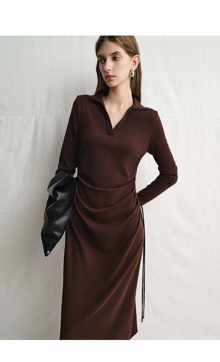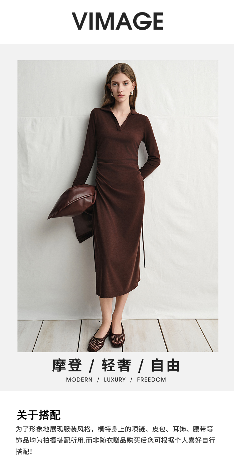 VIMAGE纬漫纪气质女神垂坠修身高腰显瘦深卡其连衣裙2025春季新款V2307920
