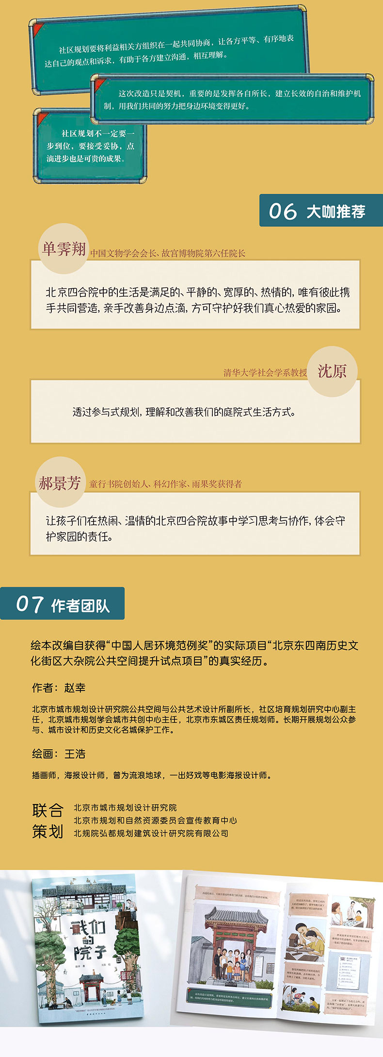 本书稿是一个以社区规划为主题的儿童教育宣传绘本。以获得2017年“中国人居环境范例奖”的实际项目——东四南历史文化街区大杂院公共空间提升试点项目为蓝本,讲述了一个院子的现状、人员构成和使用情况,以及院子里的居民在社区规划师的带领下对大杂院进行改造提升的过程。绘本对规划师在史家胡同开展的全过程参与式院落提升改造的真实经历进行了重组和转译。把多个院子改造过程中的经历与经验整合,整体呈现在一个改造故事中。以小朋友作为主人公进行故事的讲述,从儿童的视角阐述参与式规划的理念。