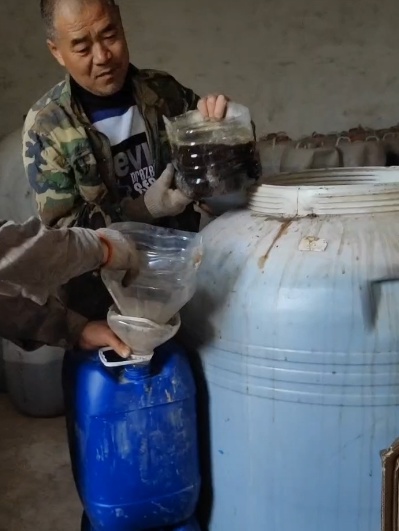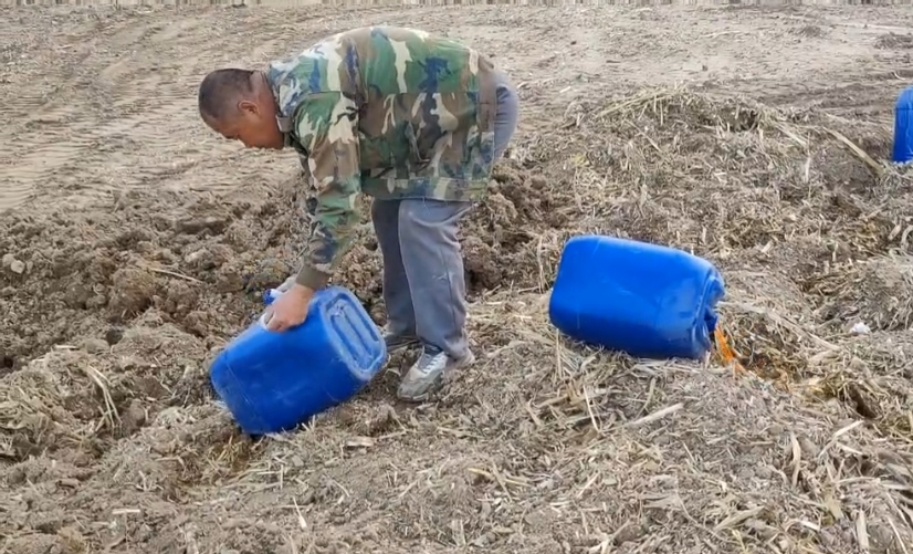 农人从大桶里分装出酵素,混合榨完油的亚麻籽饼渣做肥,将它们堆到地里。