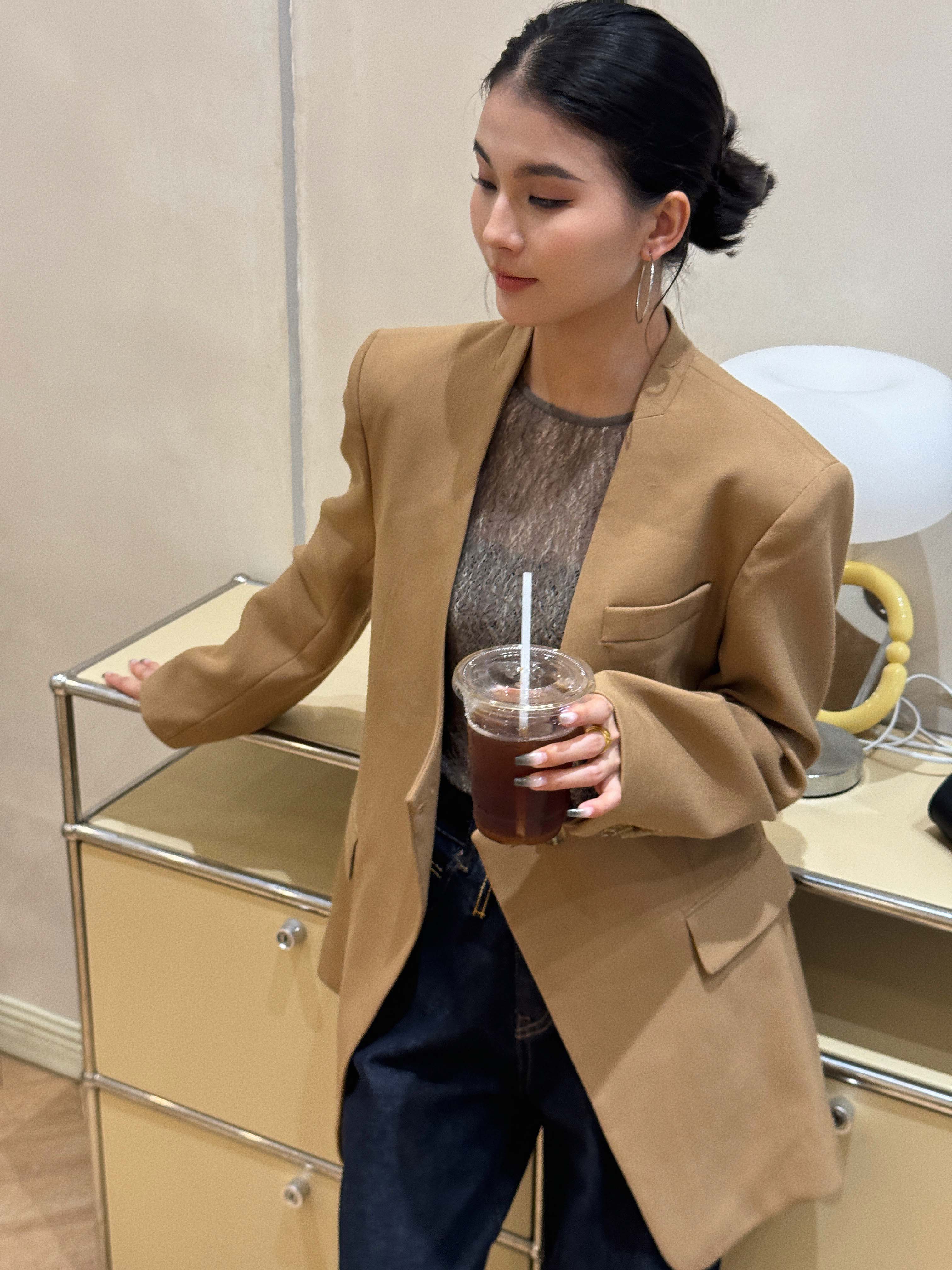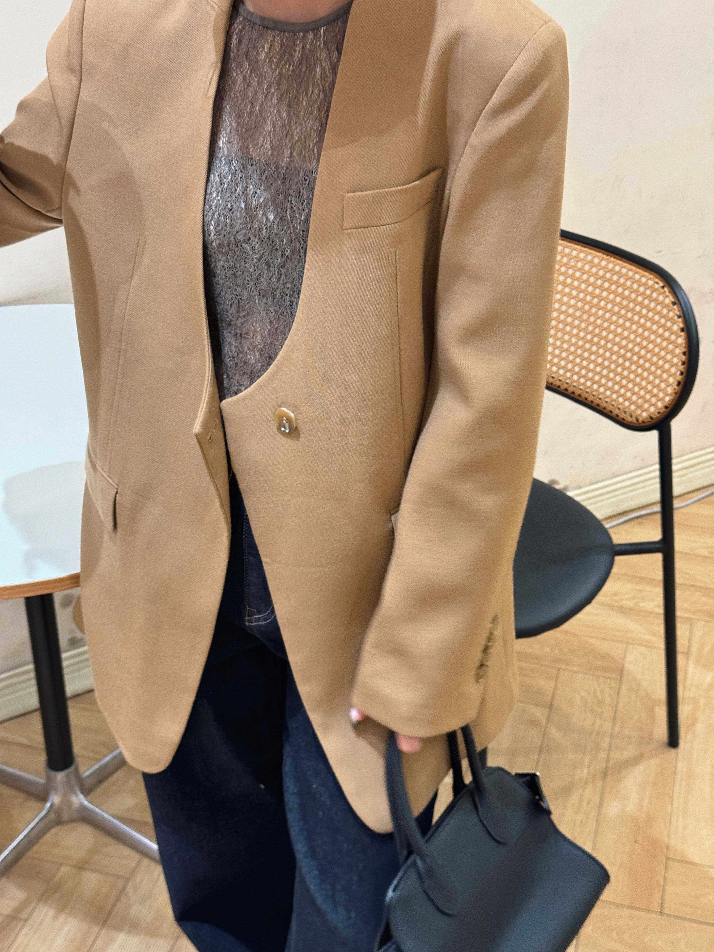 打破传统的翻折领西装版型改用无领设计,不仅让人眼前一亮,