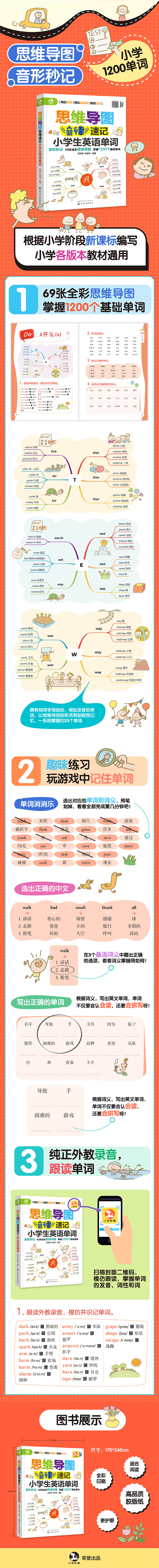 本书根据小学英语新版课程标准编写,将小学阶段需要掌握的1200余个单词进行归纳整理,将发音规律以及字母组合的近似的英语单词,用思维导图的形式展现出来,帮助学生通过形象化的方式记忆单词,同时掌握单词的读音与拼写。69张精美的思维导图搭配生动有趣的插图,让学生的单词学习不枯燥;同时每节配有精心设计的有趣的练习题,帮助学生强化学习效果、检查学习成果,更高效地掌握小学英语单词。书稿内容使用、形式轻松,适合小学阶段尤其是中高年级学生学习使用。