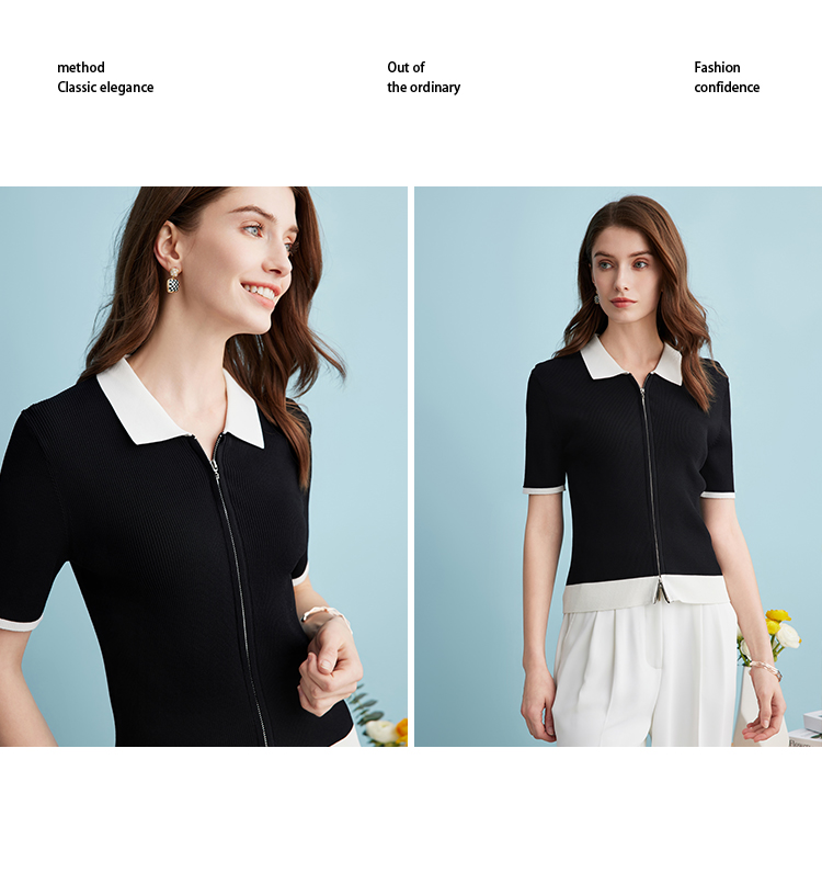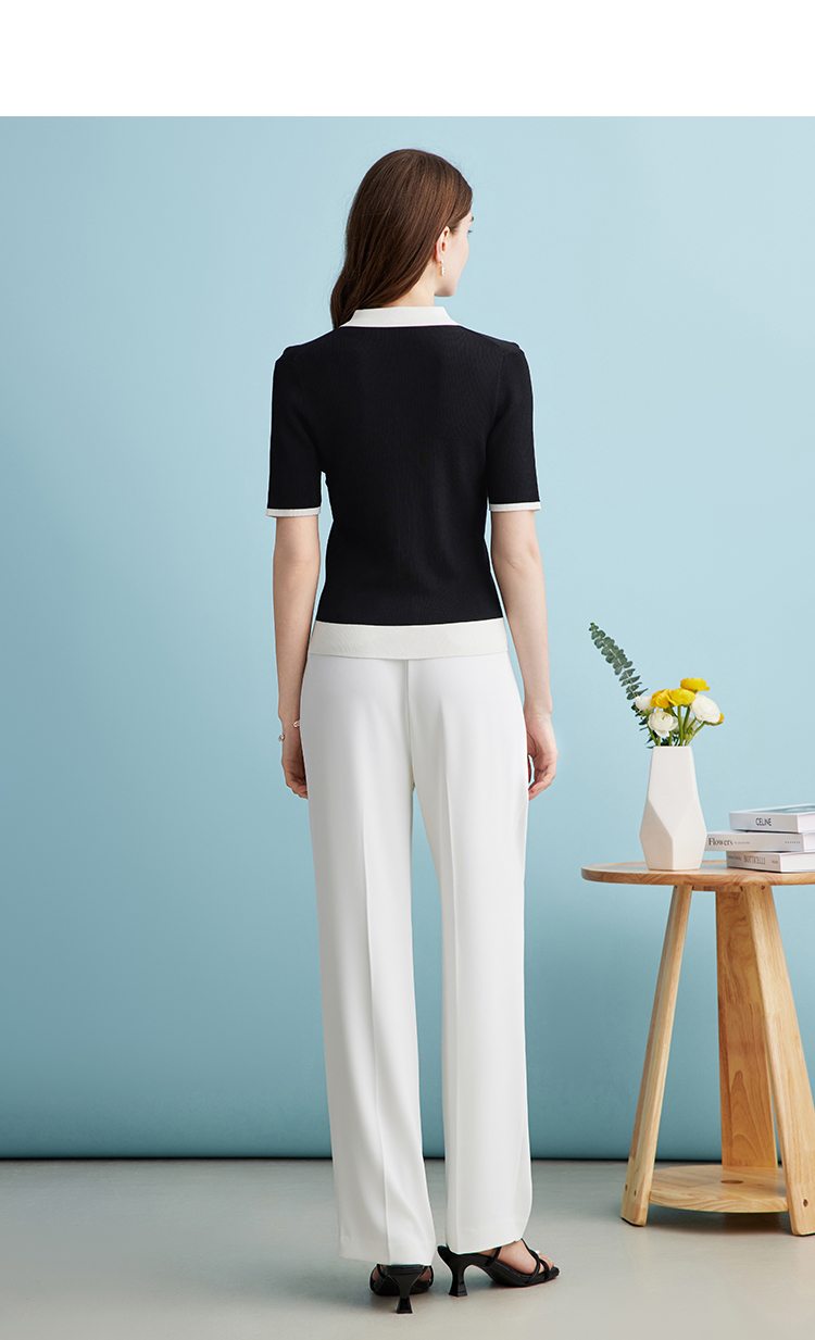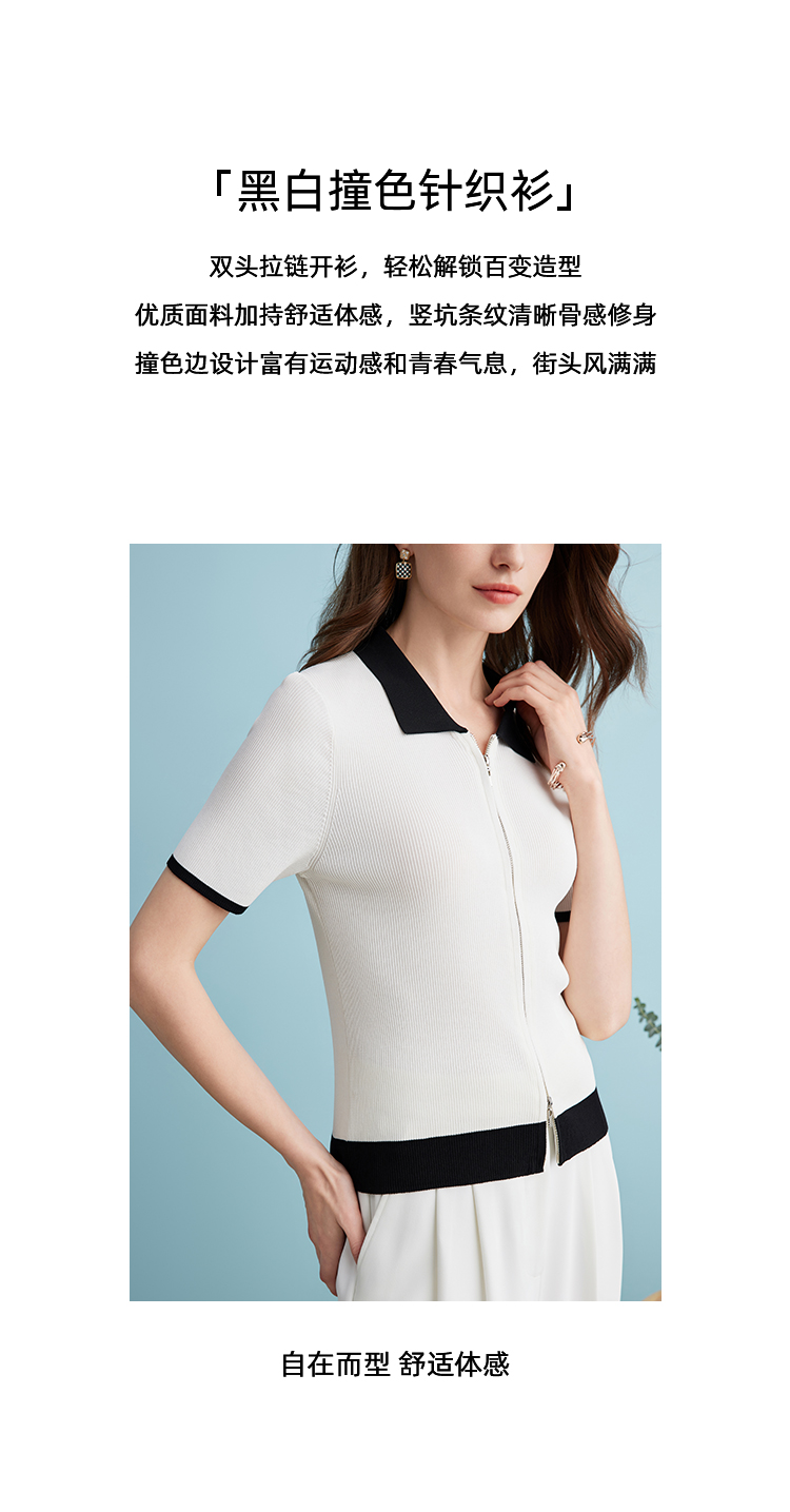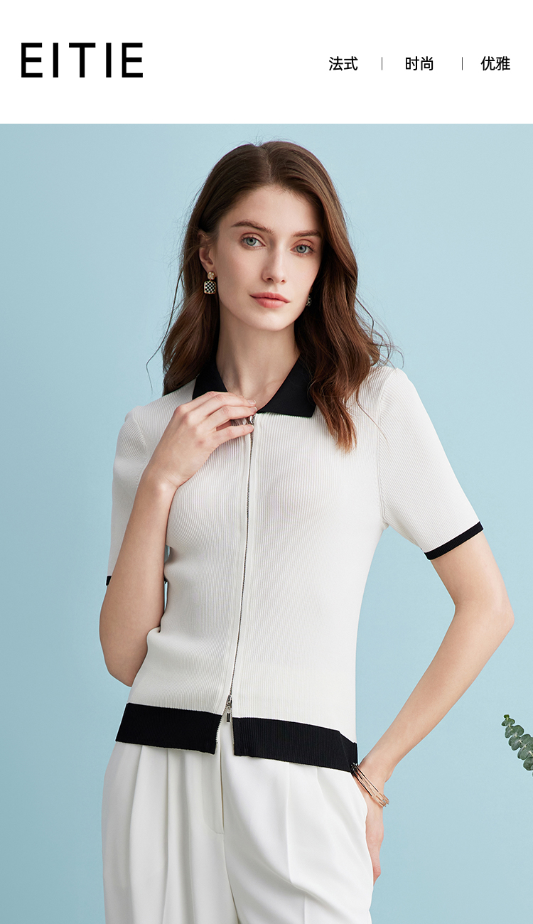 EITIE爱特爱夏季新款时尚气质通勤撞色翻领针织上衣B2401304
