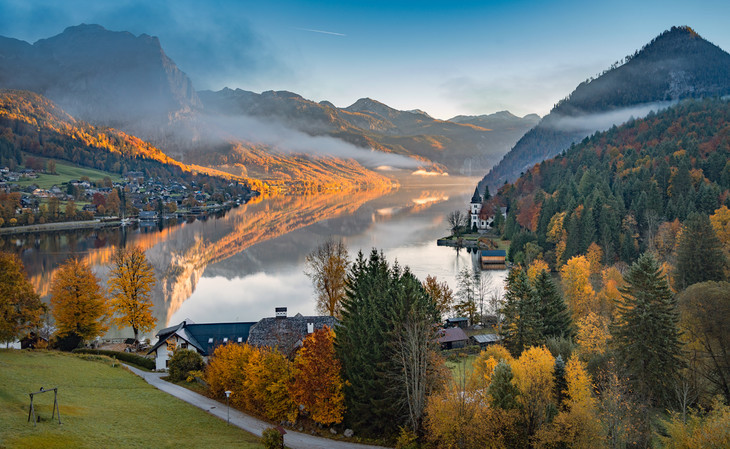 清晨可拍摄日出,漫步湖边,看湖光山色,天鹅嬉戏,偶尔还会撑来一叶扁舟。早餐后前往圣沃尔夫冈小镇,圣沃尔夫冈湖是奥地利萨尔茨卡默古特湖区最有名的湖,周围被茂密的林带、绿地和陡峭的群山环抱着。再坐小火车前往山顶,这里则是电影《音乐之声》的拍摄地之一,上山后拍摄日落。
