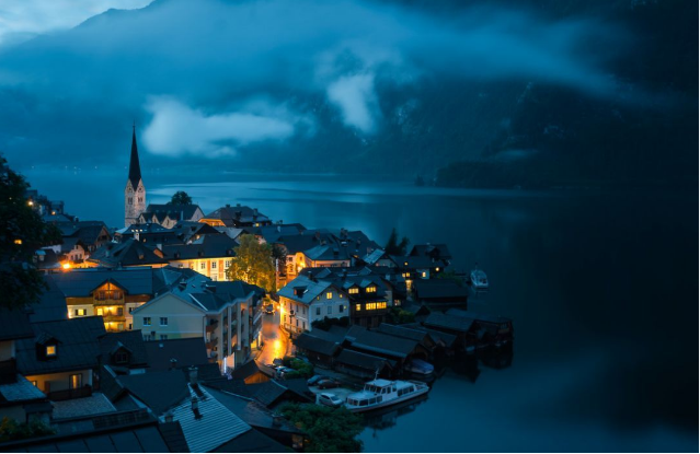 当夜幕降临,点点星光温暖着黑夜,让哈尔斯塔特看起来好像遗失的童话世界。
