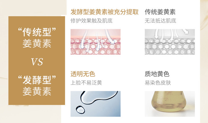 但是普通姜黄素,分子大、料体颜色深,真正起到消痘作用的姜黄酮,只有极少量能被肌肤吸收,长期使用,肤色还有可能会被染黄。