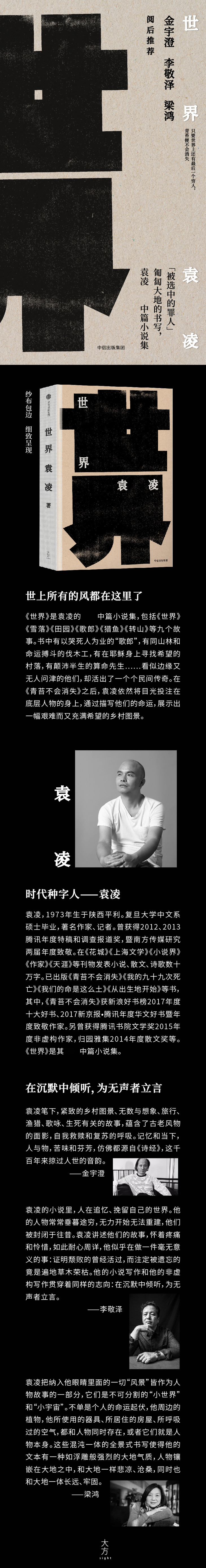 袁凌,1973年生于陕西平利。复旦大学中文系硕士毕业,作家、记者。曾获得2012、2013腾讯年度特稿和调查报道奖,暨南方传媒研究两届年度致敬。在《花城》《上海文学》《小说界》《作家》《天涯》等刊物发表小说、散文、诗歌数十万字。已出版《青苔不会消失》《我的九十九次死亡》《我们的命是这么土》《从出生地开始》等书,其中,《青苔不会消失》获新浪好书榜2017年度十大好书、2017新京报·腾讯年度华文好书暨年度致敬作家。另曾获得腾讯书院文学奖2015年度非虚构作家,归园雅集2014年度散文奖等。《世界》是其中篇小说集。