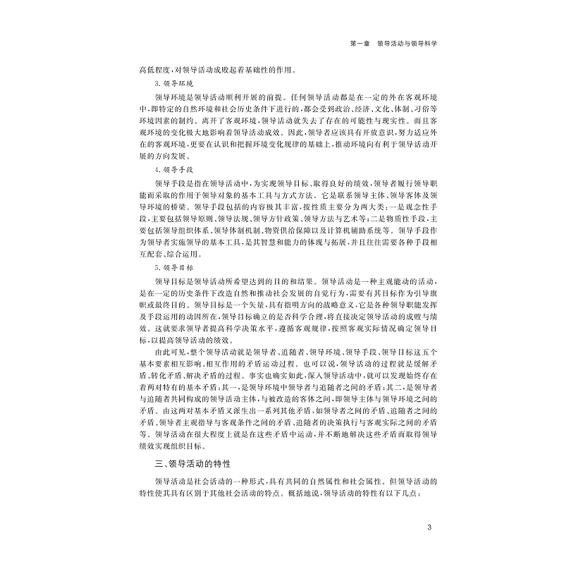 依据领导学开设主要专业课时计划与安排,并兼顾企事业单位领导干部的领导科学知识的相关培训需要,主要内容:领导活动与领导科学、领导理论与领导哲学、领导环境与领导体制、领导者与追随者、领导决策:领导活动科学化、用人激励:领导活动艺术化、领导绩效:领导活动的归宿等