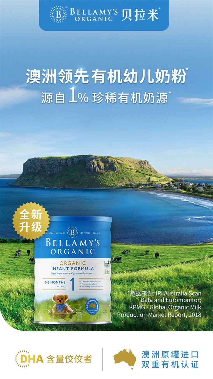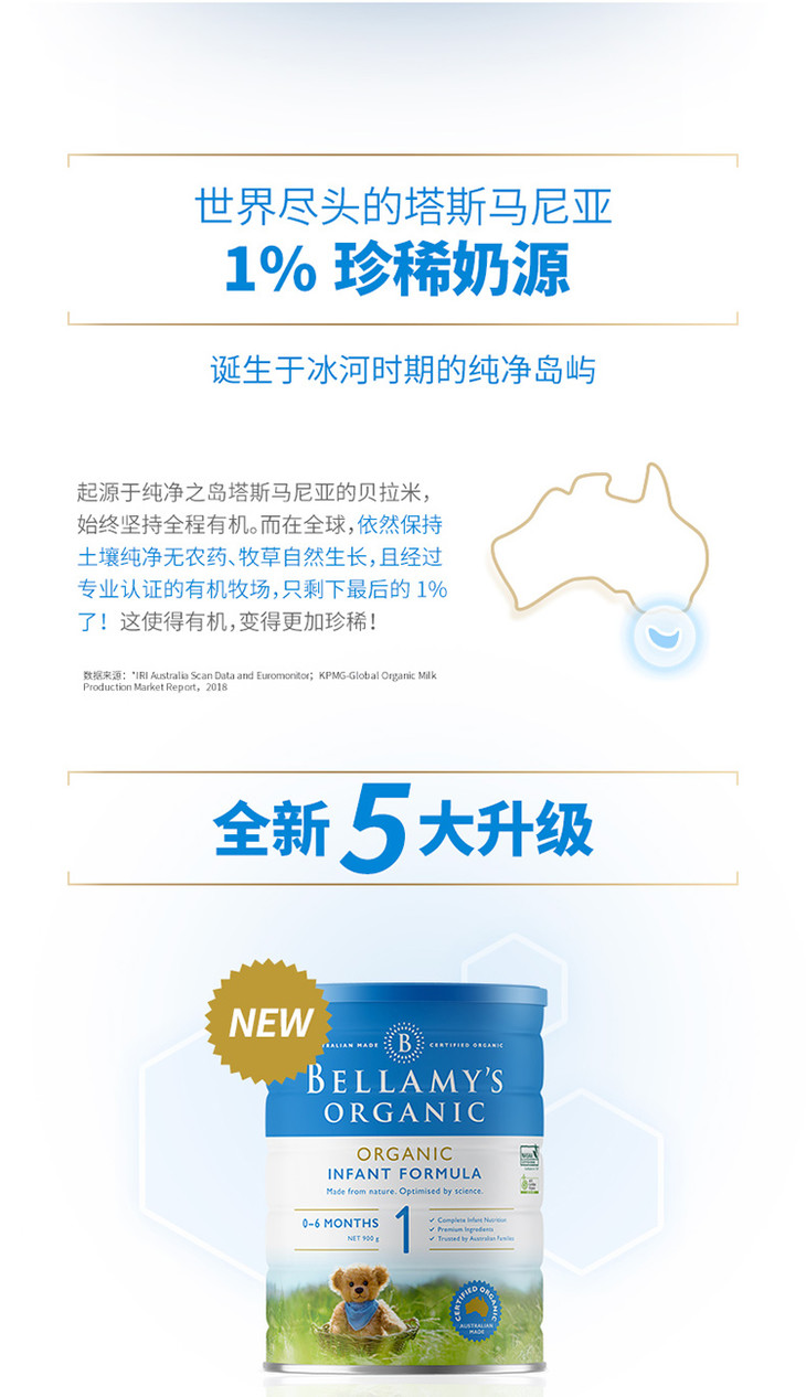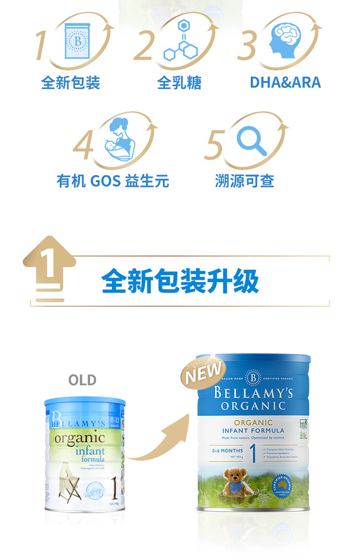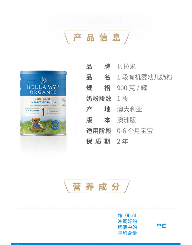 【海外直邮】贝拉米 Bellamy’s 婴幼儿有机奶粉1段 (0-6月) 900克 六罐装