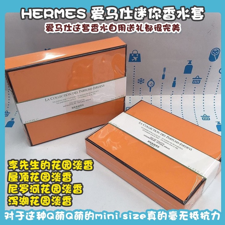 HERMES 爱马仕迷你香水套👍爱马仕这套香水自用送礼都很完美😘,对于这种Q萌Q萌的mini size真的毫无抵抗力👅。李先生的花园是柑橘系花香🍊,酸酸的清爽粉质感,让人留恋。屋顶花园是一座遗世的静逸花园🌸,植物气息非常清新。尼罗河花园像是夏天的惬意凉风🍃混合着柚子的清香青芒果,是文艺女青年的挚爱。泻湖花园很高级的香味👀,恬静温柔的木香气息,令人欢愉~套装包括:(李先生的花园淡香➕屋顶花园淡香➕尼罗河花园淡香➕泻湖花园淡香)4*15ml。