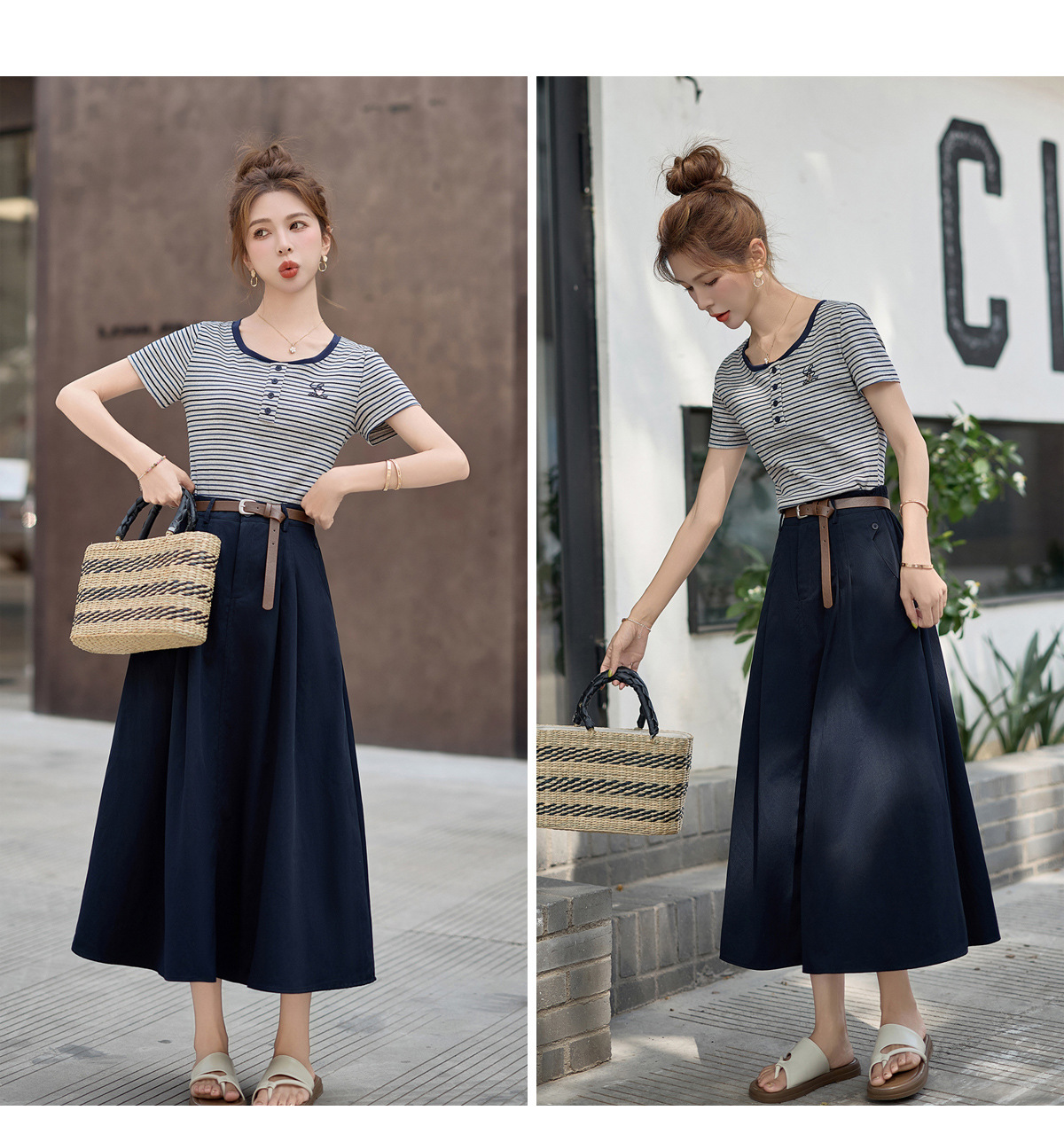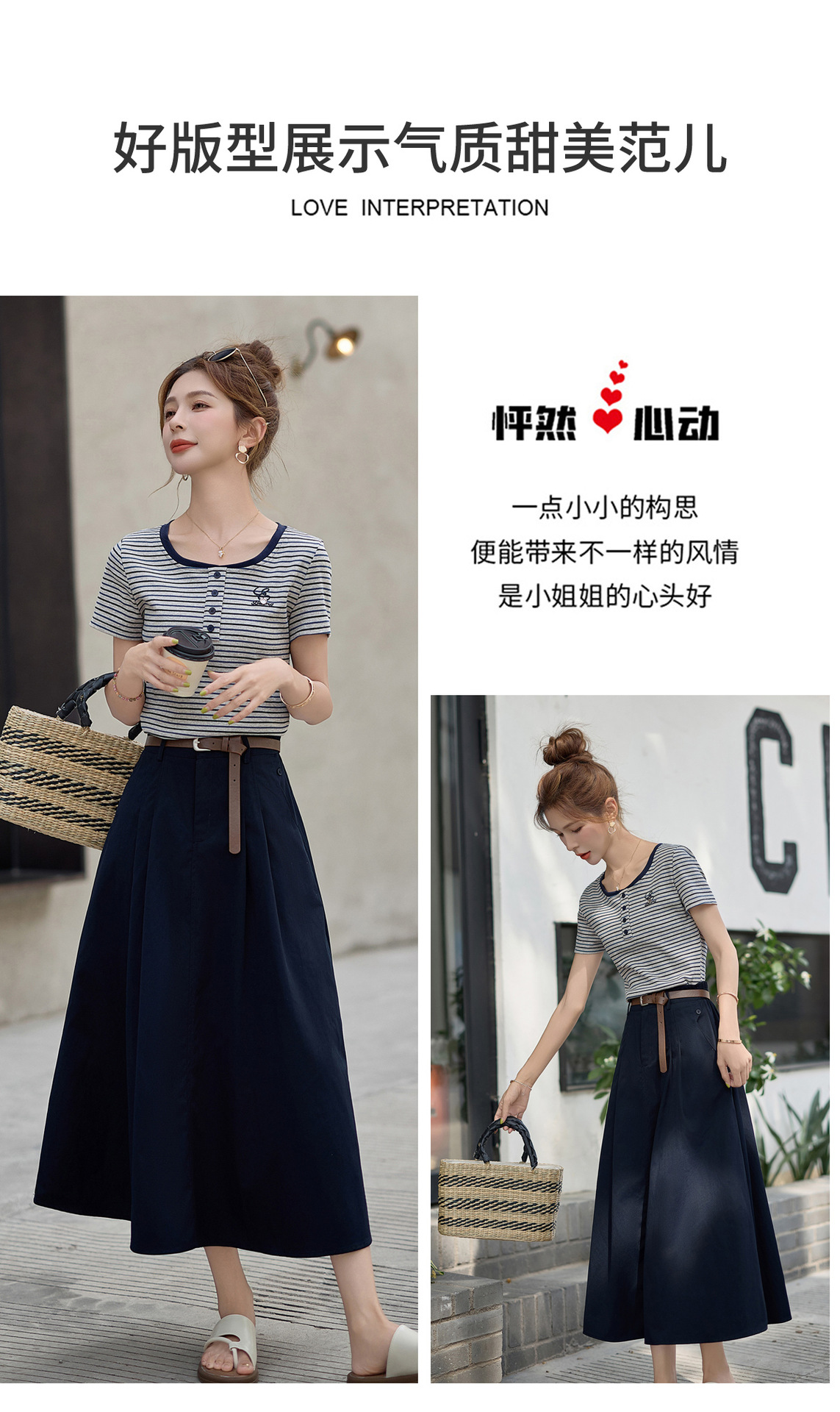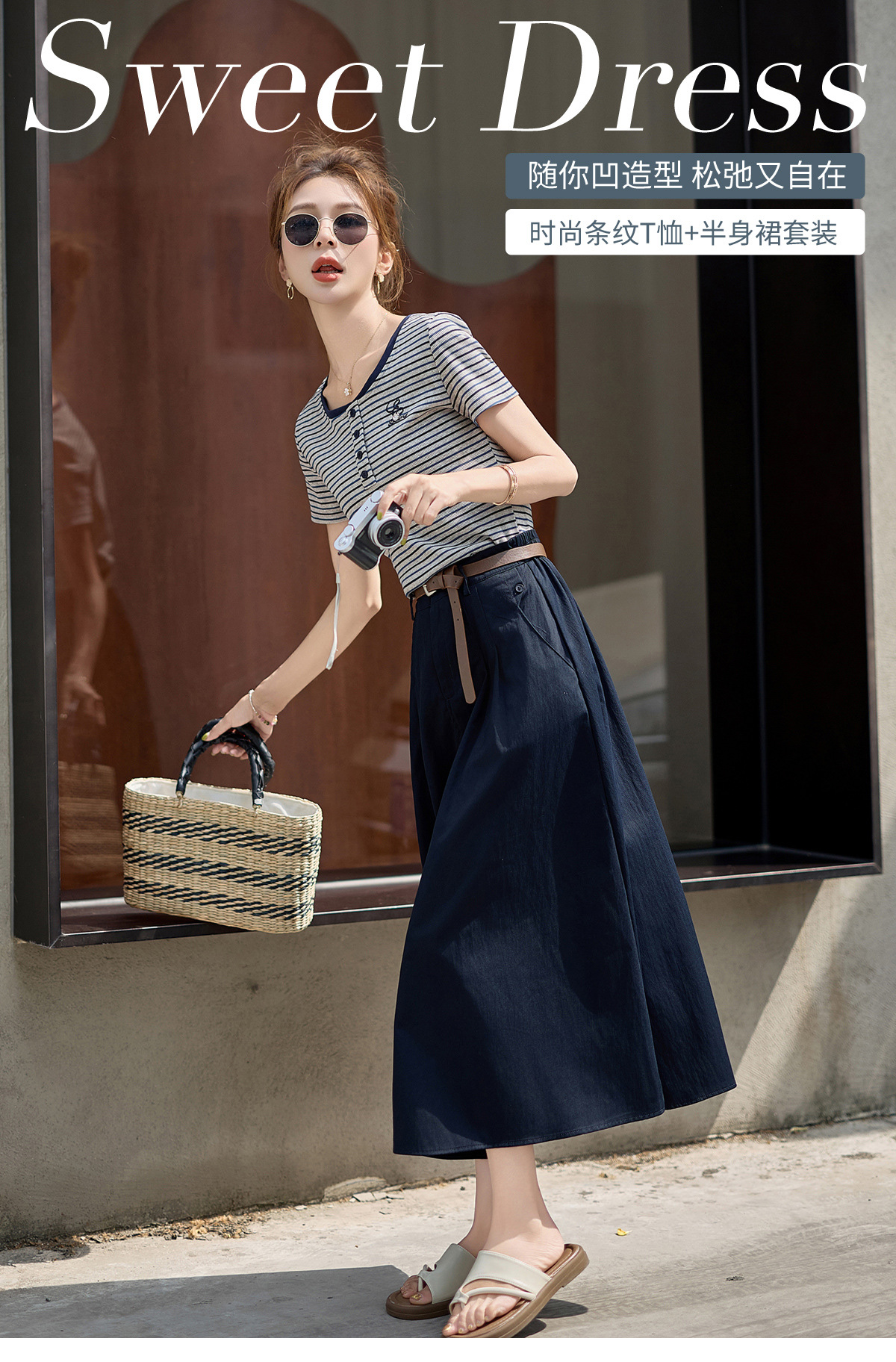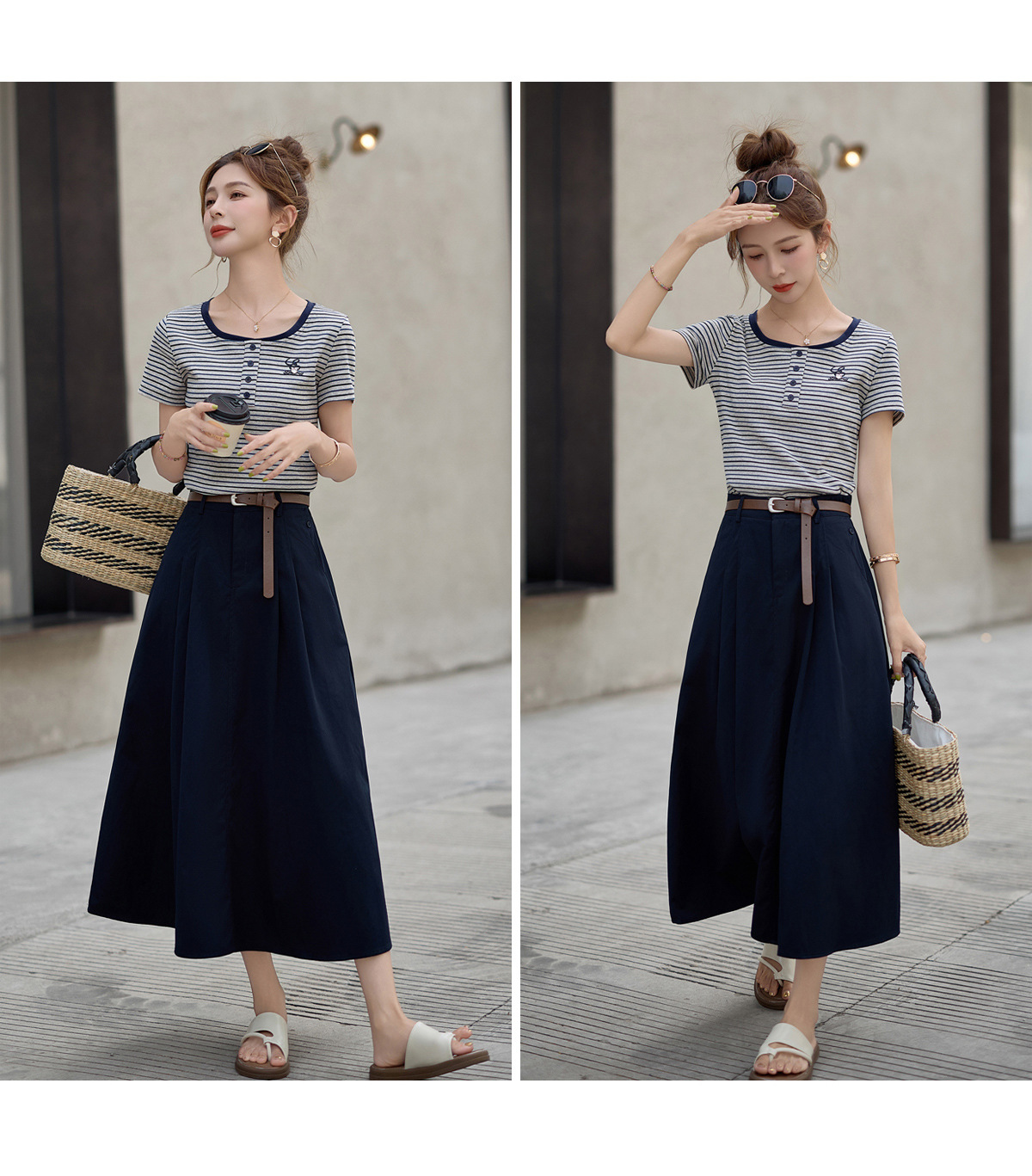 FY2587时尚休闲套装女2025夏季新款超火一整套条纹T恤休闲半身裙两件套