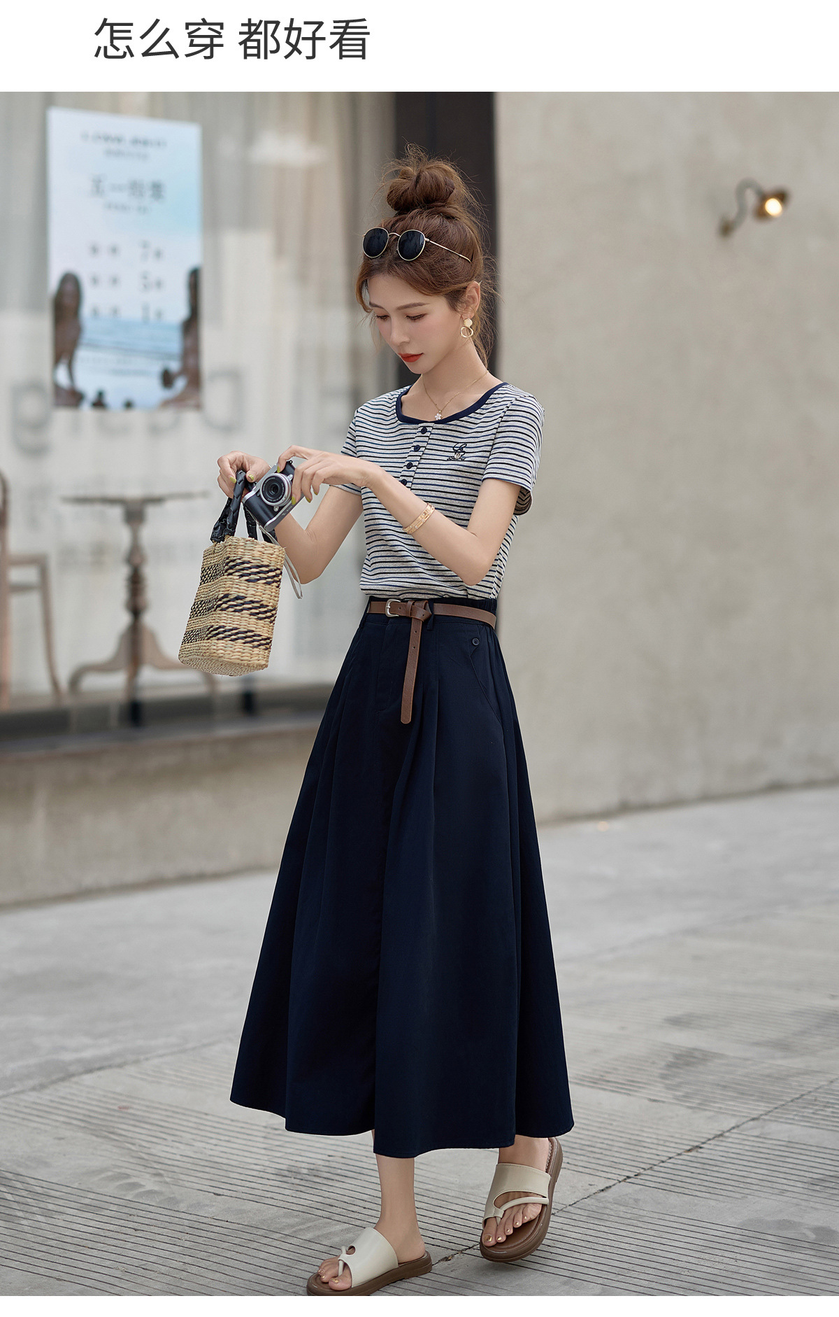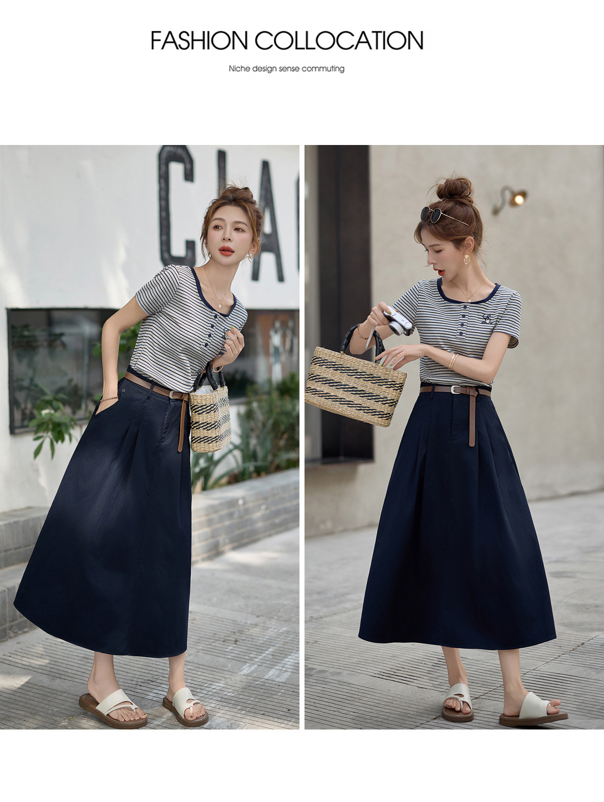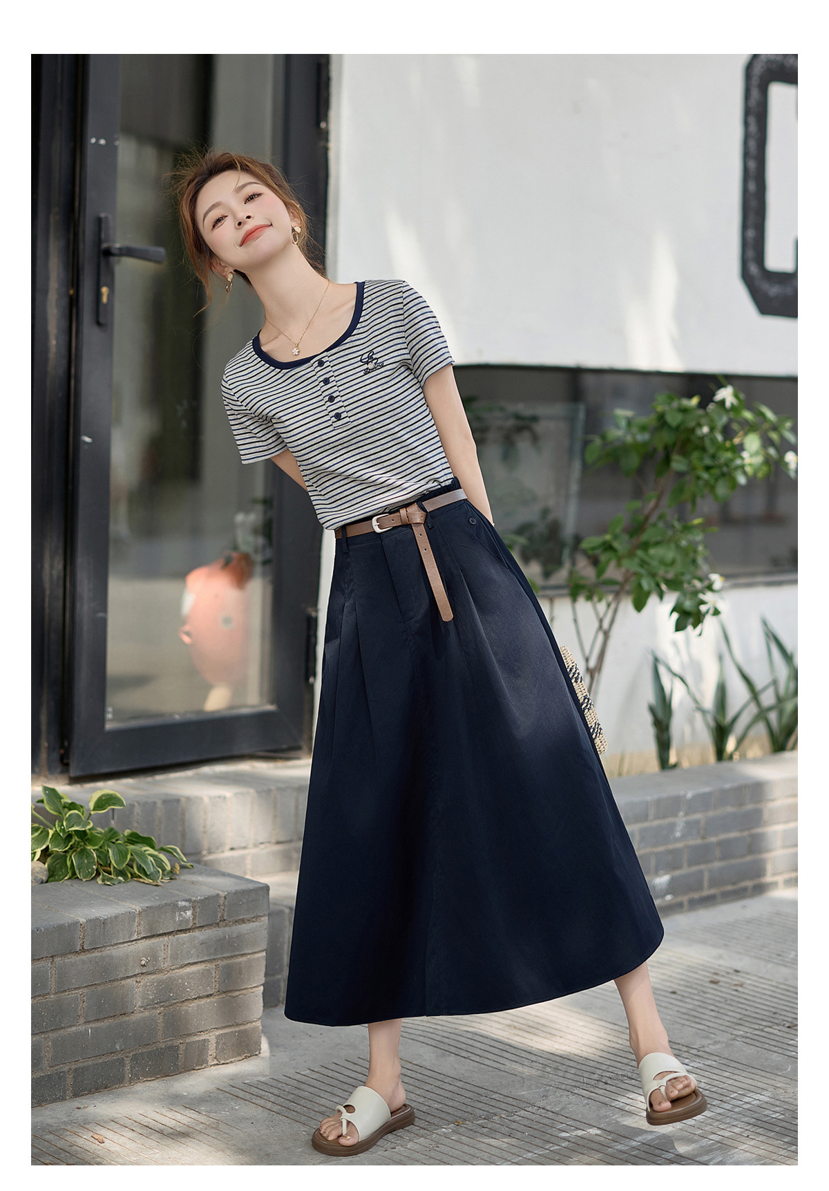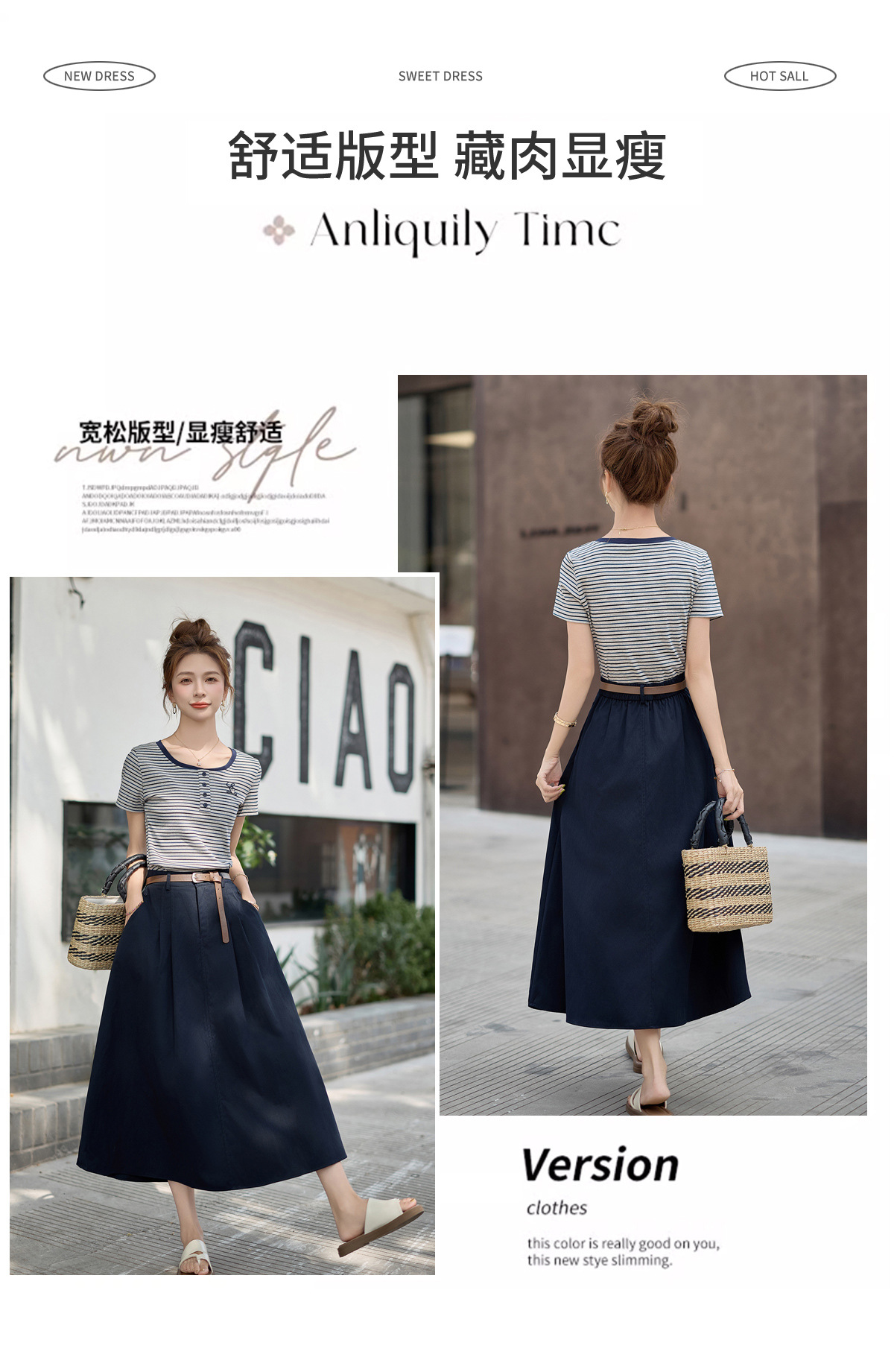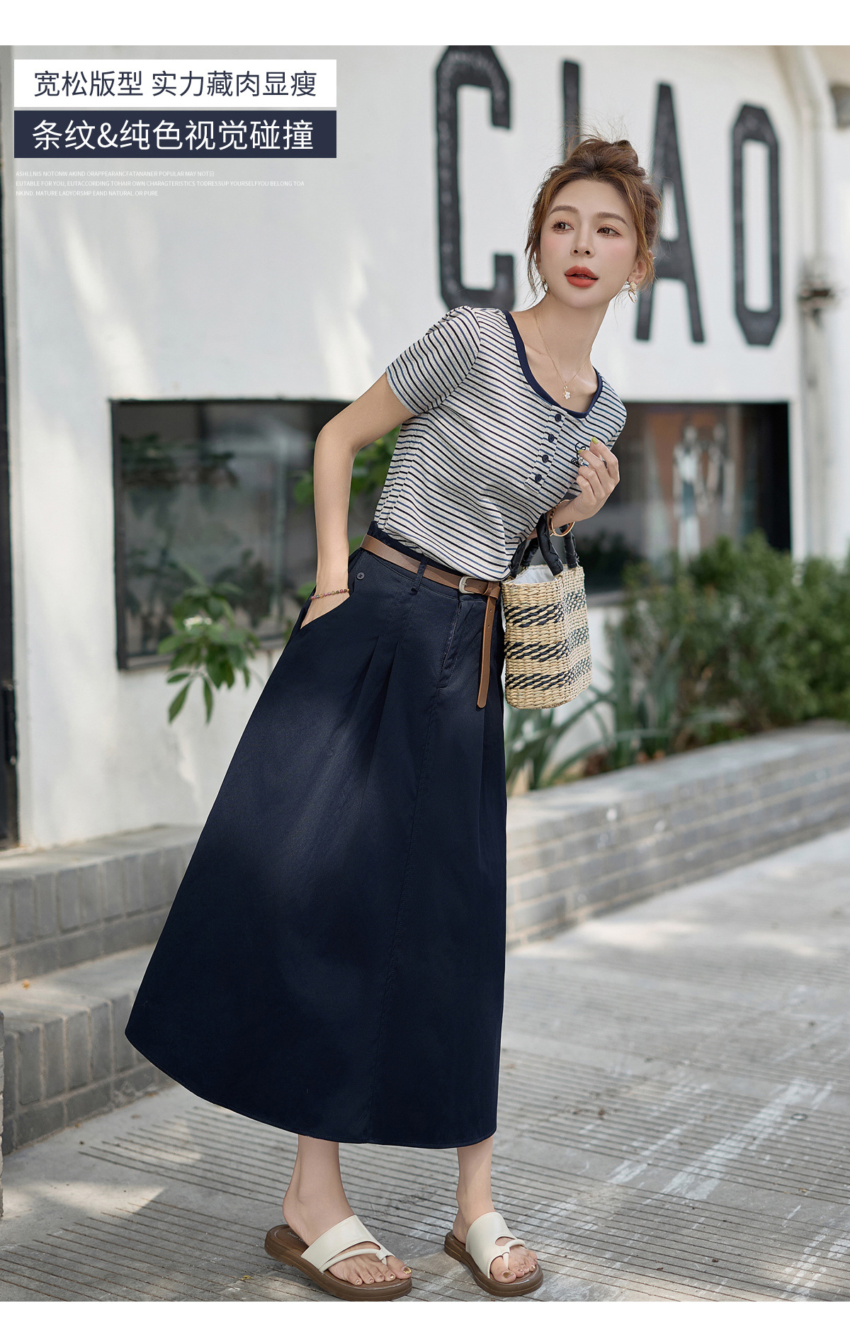 FY2587时尚休闲套装女2025夏季新款超火一整套条纹T恤休闲半身裙两件套