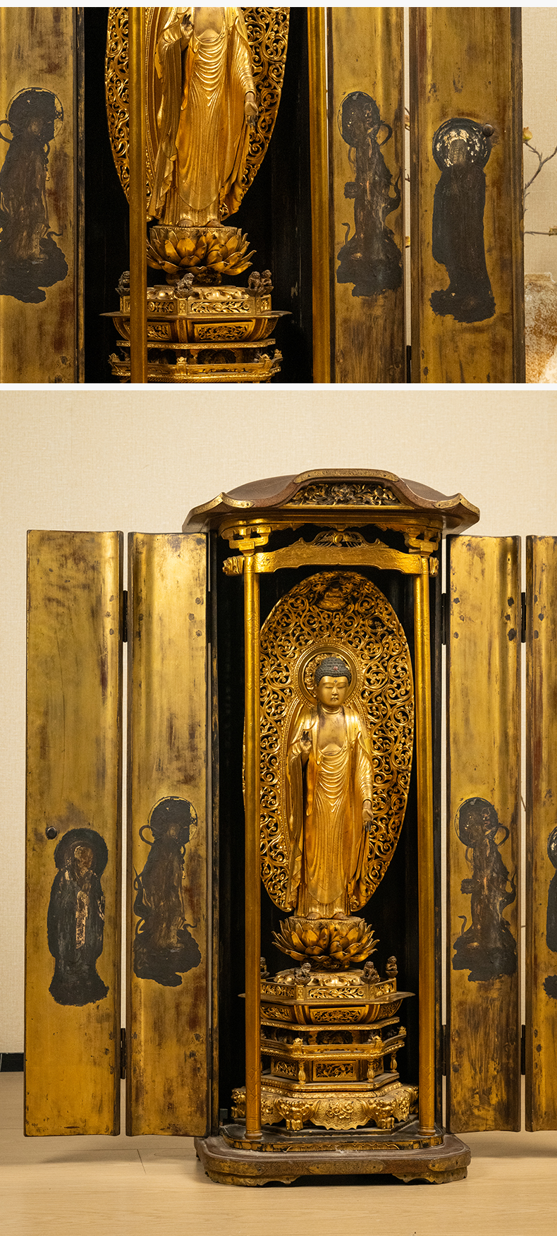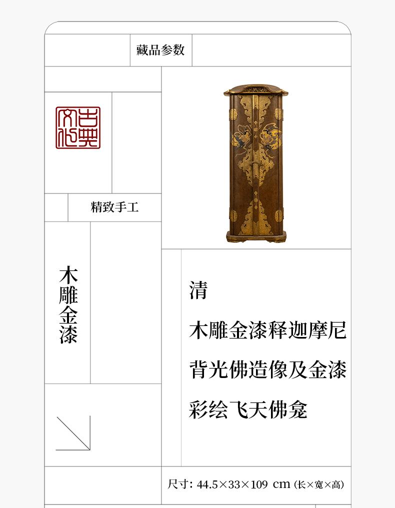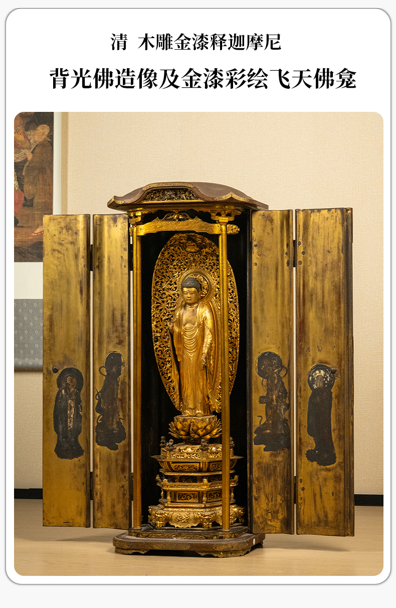 清 木雕金漆释迦摩尼背光佛造像及金漆彩绘飞天佛龛