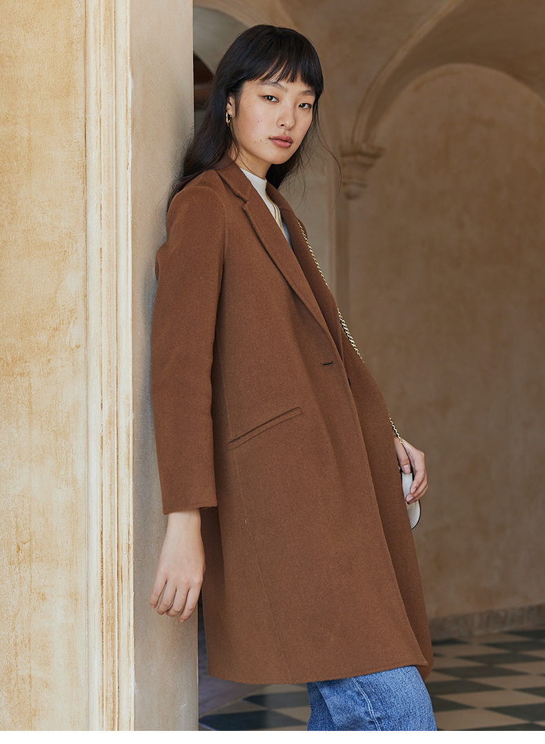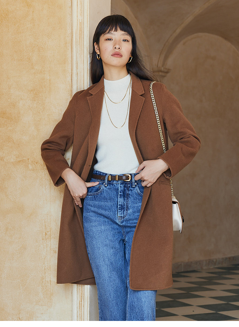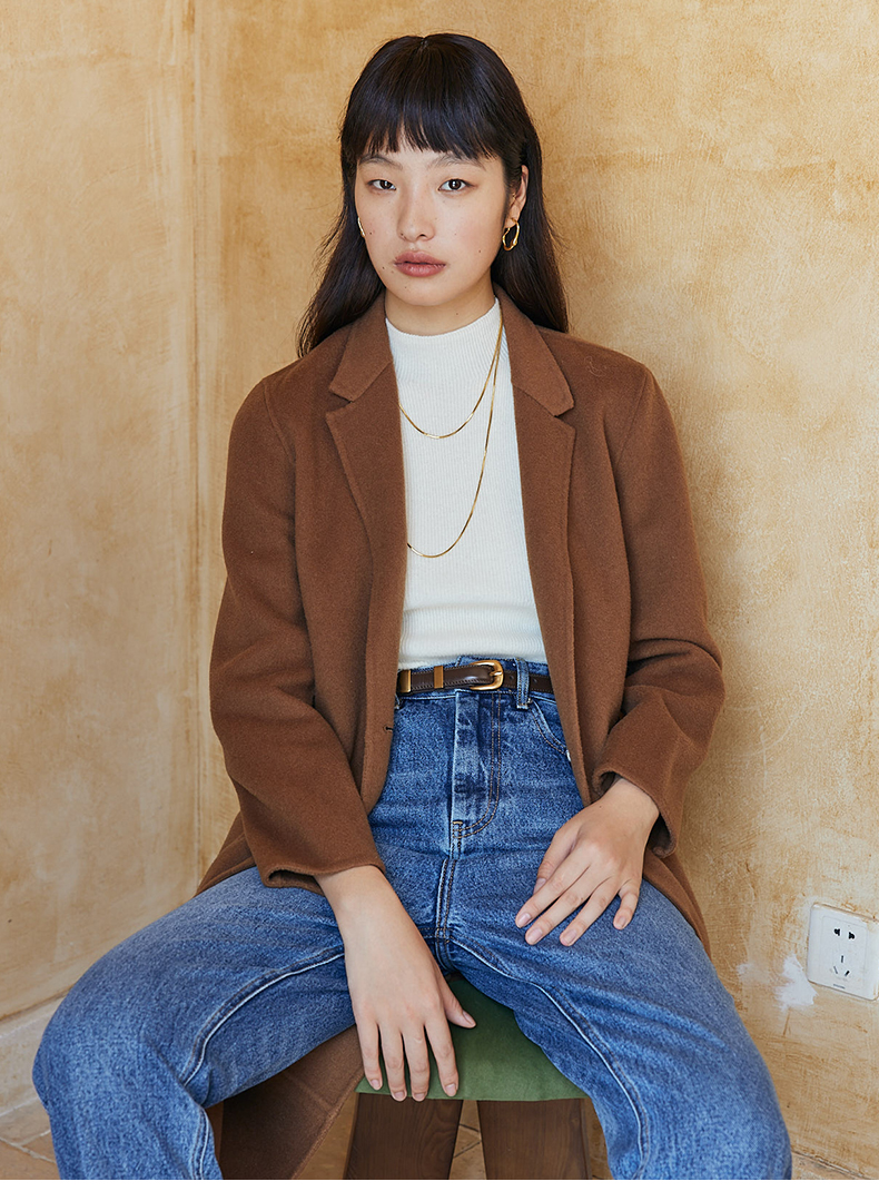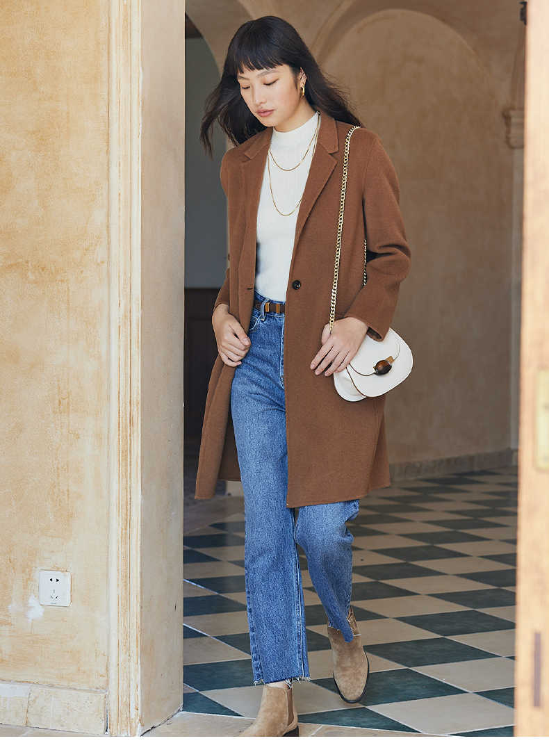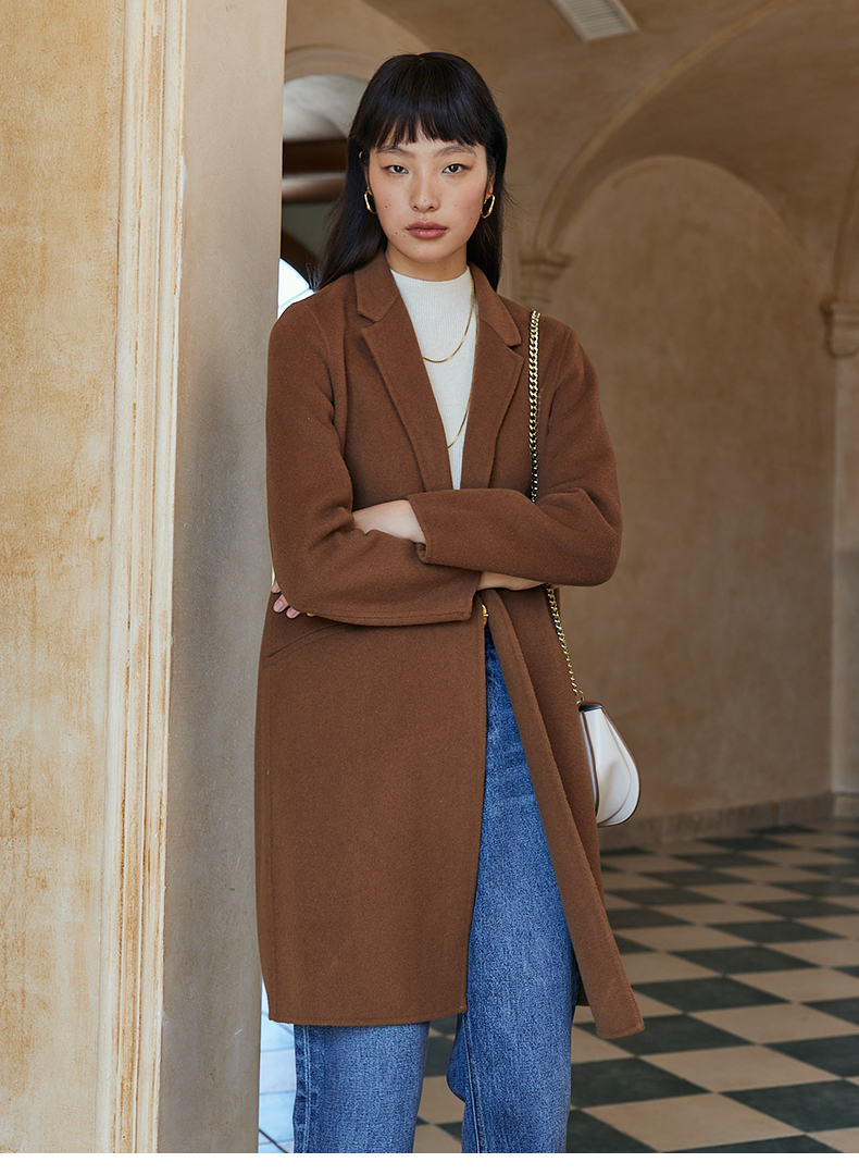 IN AND ON 轻奢原创设计100绵羊毛小翻领长款双面毛呢大衣外套女