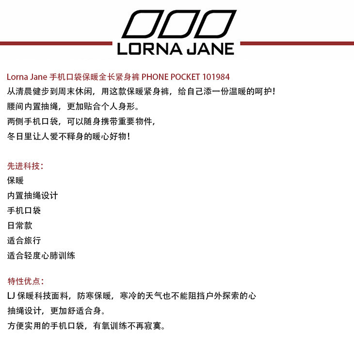 【清仓秒】澳洲Lorna Jane 手机口袋保暖全长紧身裤 PHONE POCKET 101984(清仓产品,收货7天内支持调货、不退款)