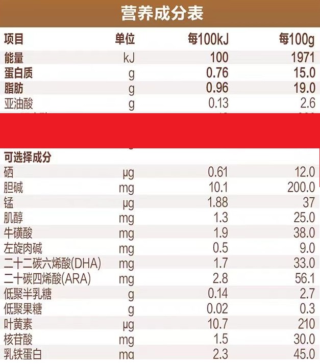 (1)“成分表”中“蛋白质”下“乳清蛋白”的含量?
