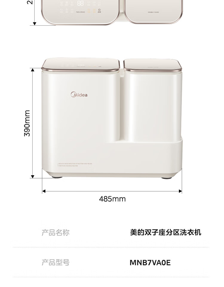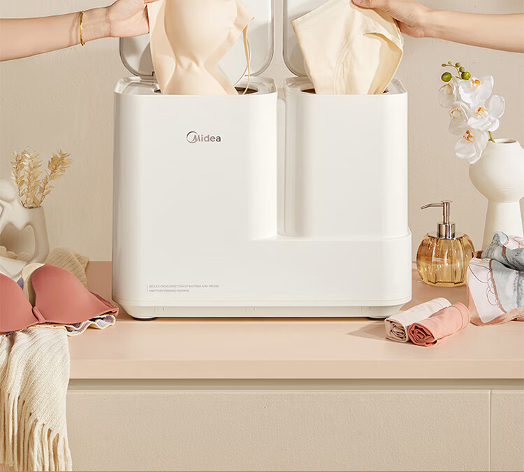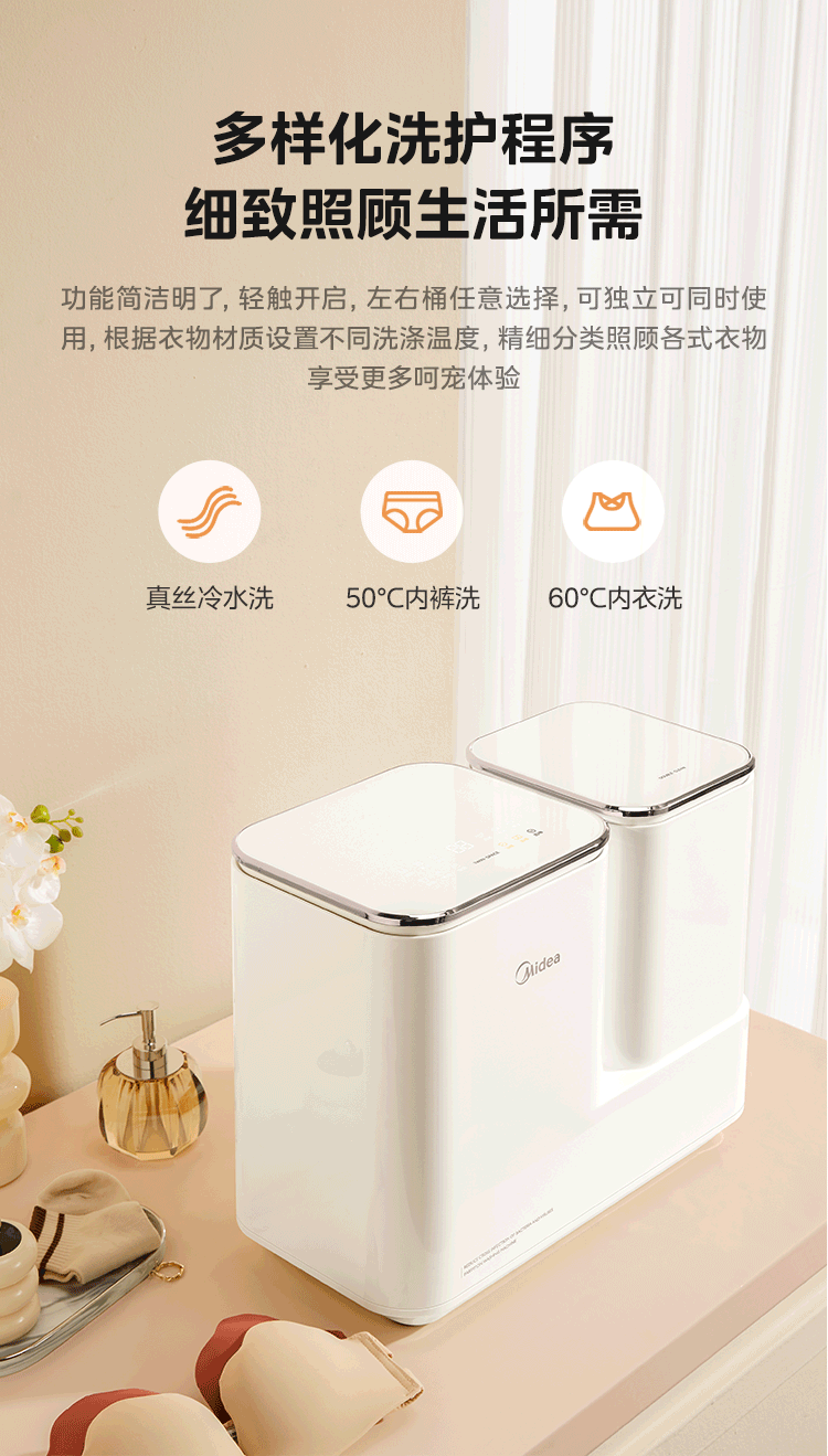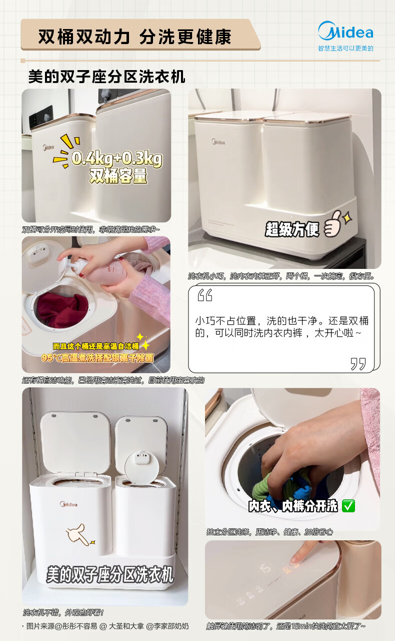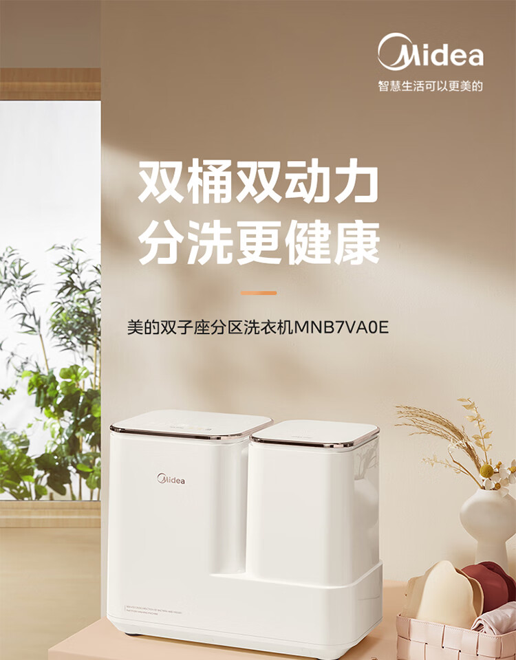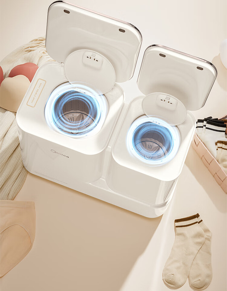 美的(Midea)双子座分区洗衣机 迷你小型全自动内衣裤袜台式波轮 高温煮洗除菌除螨 小巧不占地一键筒自洁 双桶分区洗