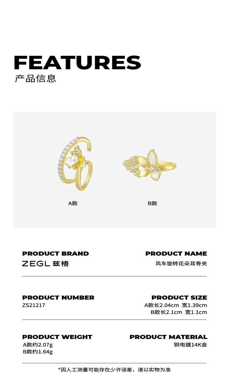 ZEGL设计师花朵耳夹女夏高级感小众耳骨夹耳环法式复古无耳洞耳饰