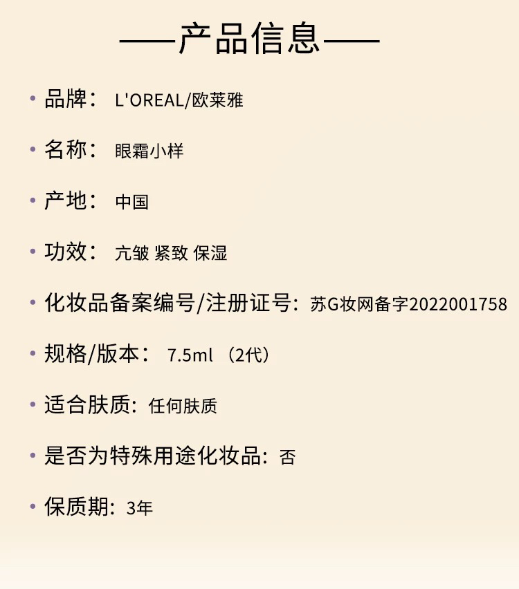 【专柜小样】法国 L'OREAL 欧莱雅 紫熨斗全脸眼霜7.5ml