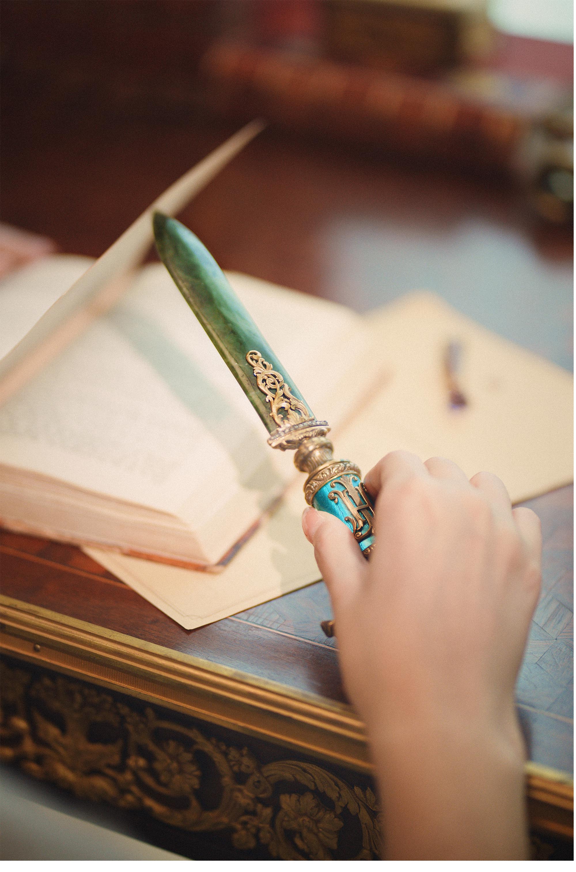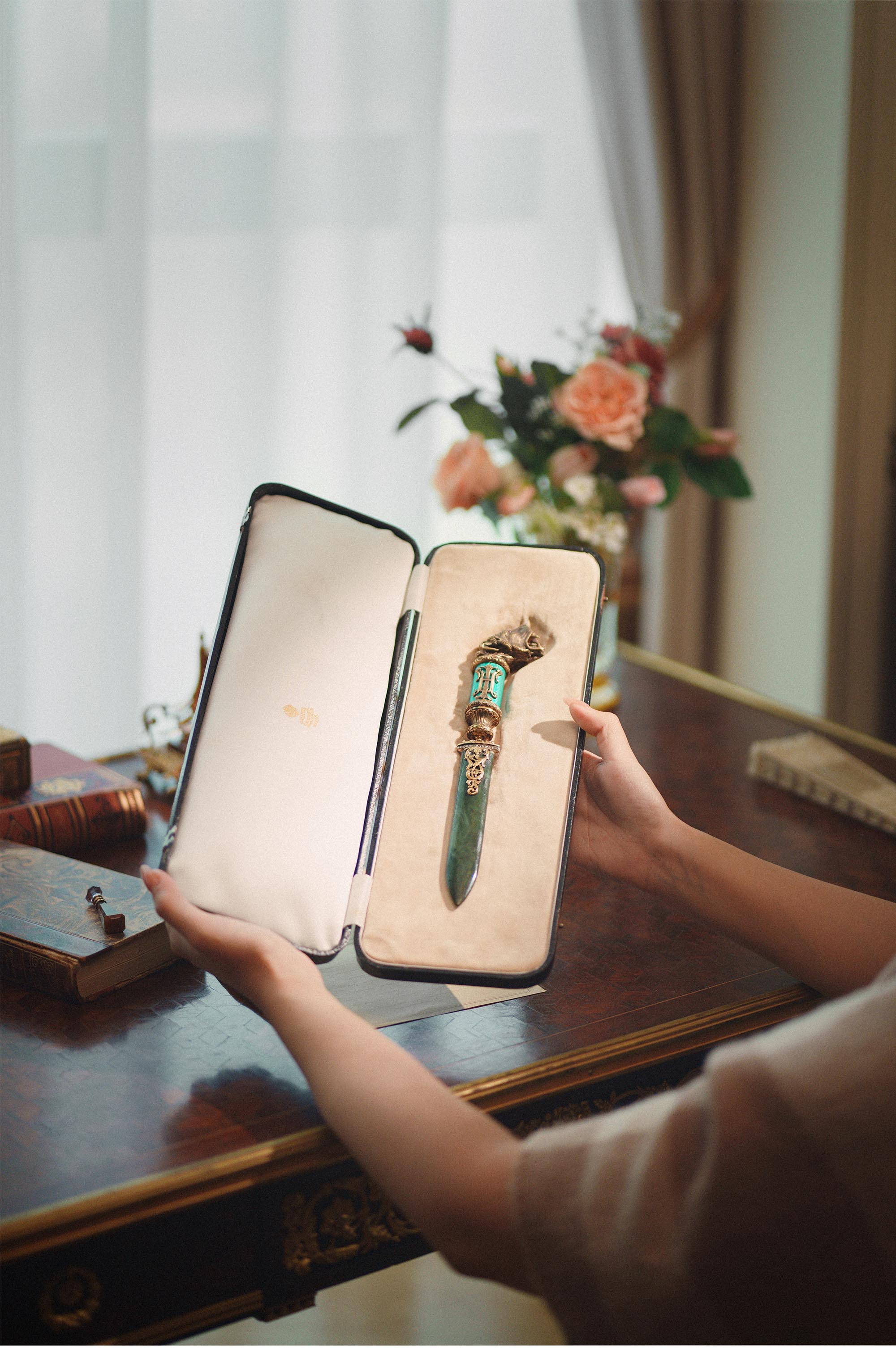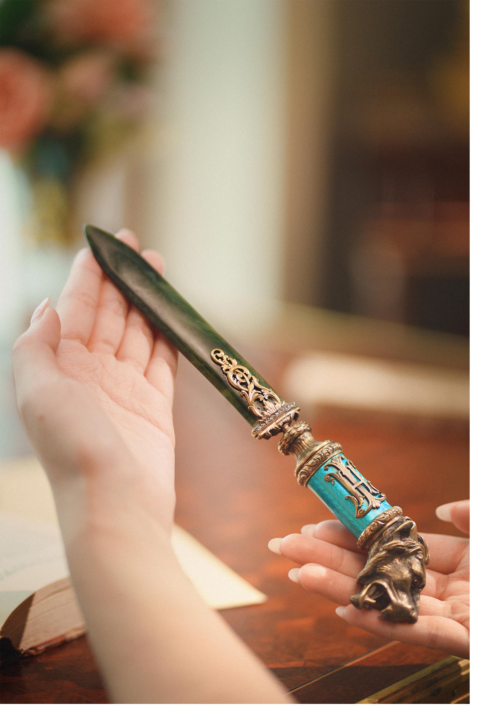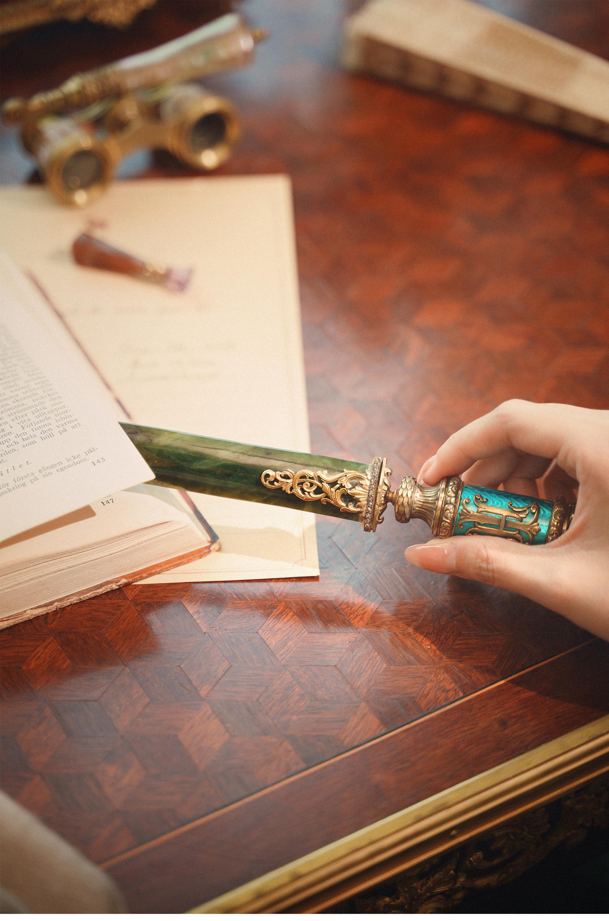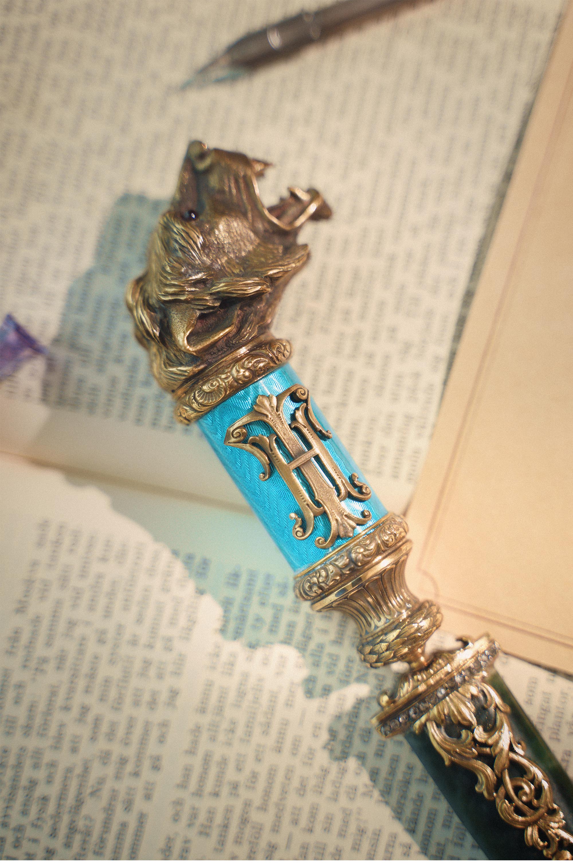 19世纪俄罗斯出品狮首造型纯银镀金镶嵌钻石蓝色玑镂珐琅碧玉翻书杖