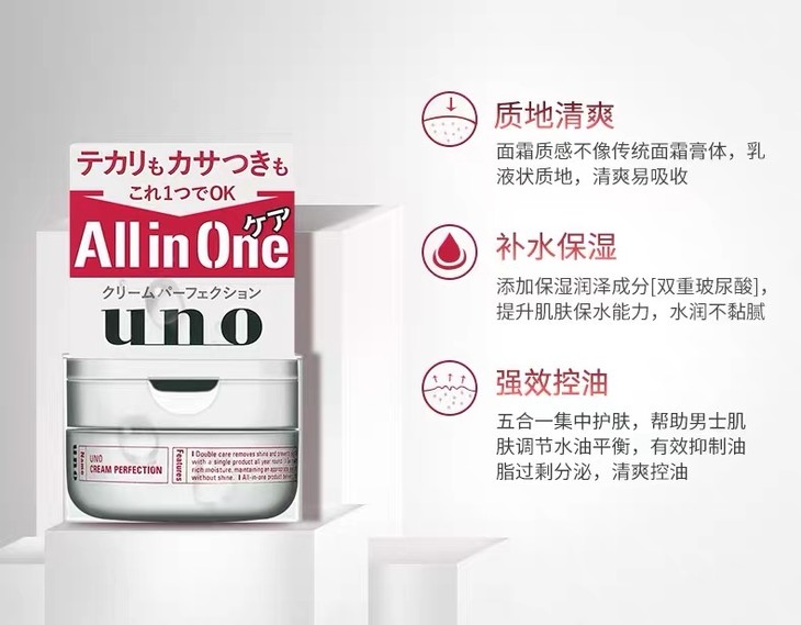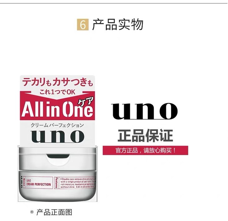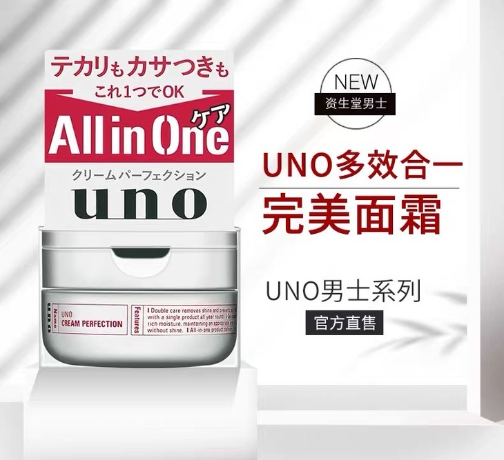 3、功效:男士不爱涂脸,皮肤又干的,资生堂这个便宜又好用。日本资生堂uno男士五合一面霜,秋冬风干脸干,别忘了给老公备起来,同时解决泛油光和皮肤干燥的肌肤问题。另外,集合化妆水,乳液,美容液,乳霜,面膜五功效于一身。男士懒人必备(这款不带防晒)