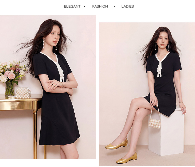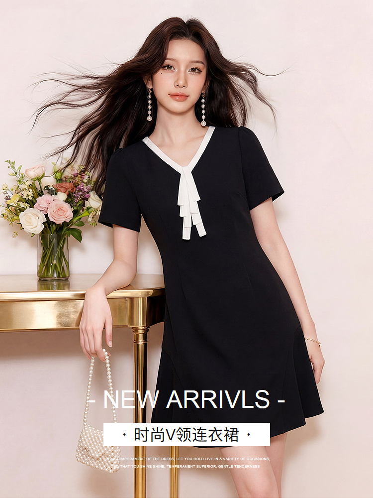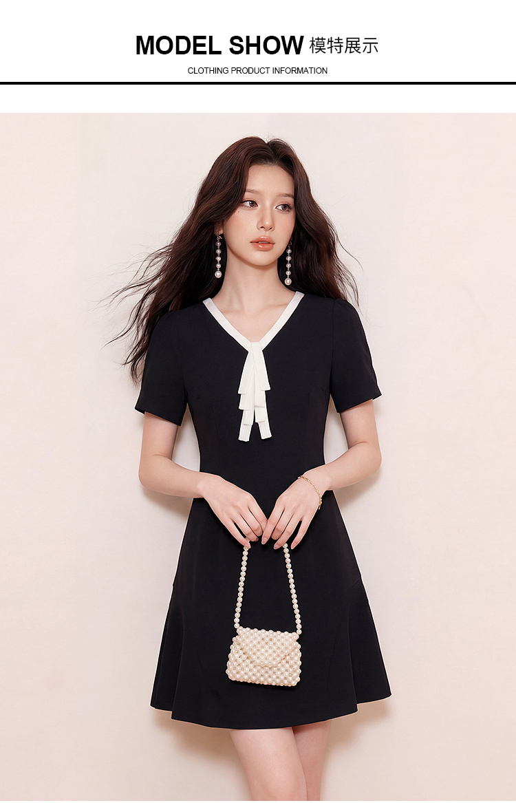 奢姿大码女装2026夏季减龄撞色飘带V领连衣裙胖妹妹赫本风裙子9962860066